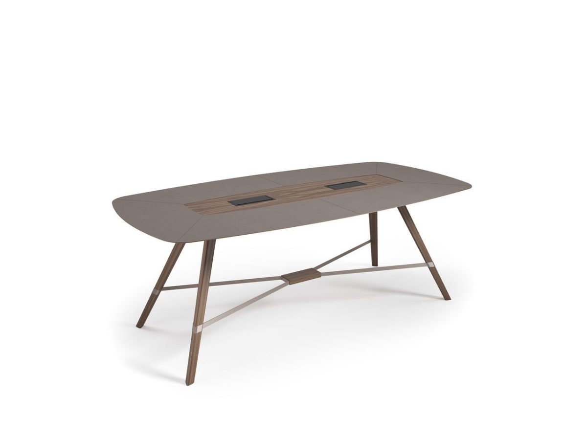 The Connect meeting table features a leather-covered top with two integrated boxes equipped with power and USB sockets. The legs can be made to match the top or with a contrasting lacquered finish. This table combines refinement and efficiency, offering an elegant and functional solution for professional environments. The integrated technological features ensure connectivity and practicality, making it ideal for contemporary executive spaces.