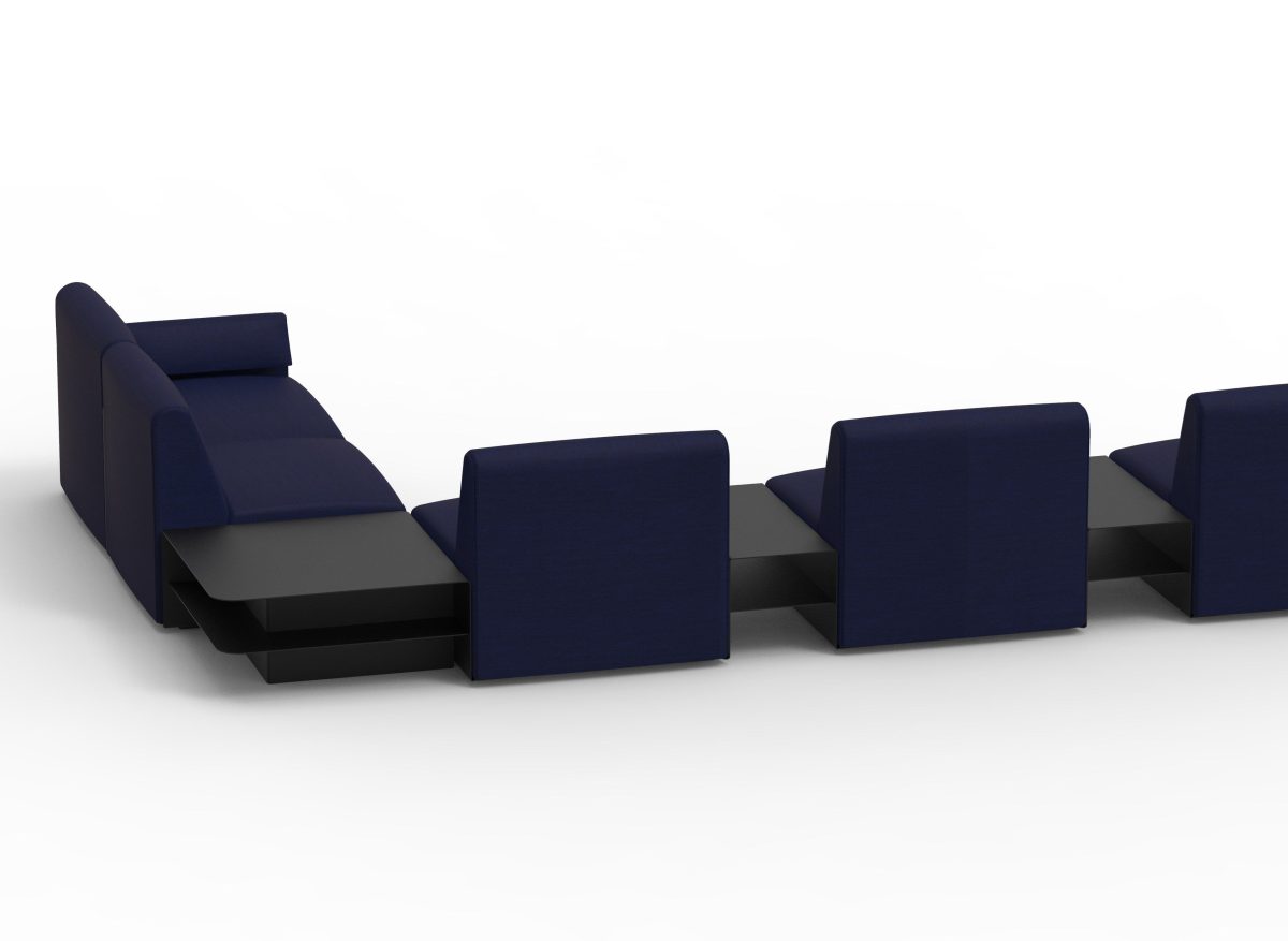 Costume expands further with the addition of two low tables in folded aluminium plate, powder coated. The low tables are conceived to be placed between two seating units or ottoman (not as ending units of a seating composition). Power supply available on request.