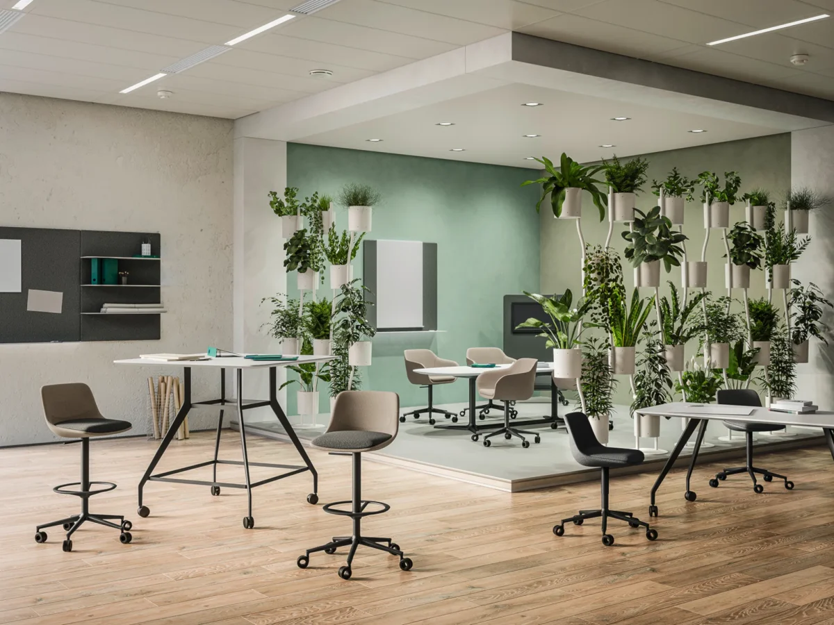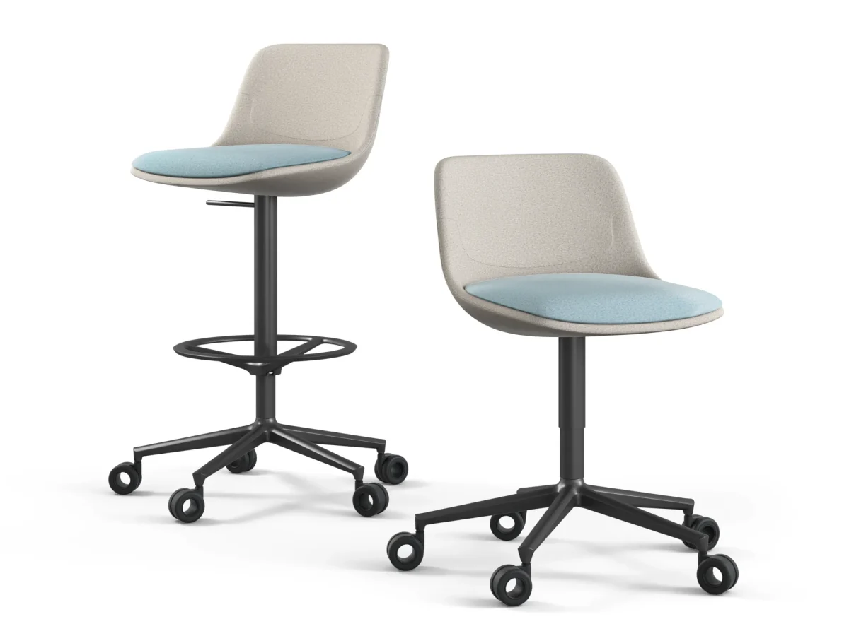 On top of the world with crona up! The high chair and stool for flexible office areas are height adjustable, mobile and turn easily, while the specially moulded seat upholstery makes them extremely versatile. Extremely comfortable the high chair also sports a supporting circular base ring and fully upholstered back in a separate colour. Thus, agile sitting creates highlights throughout the room. Refreshing!
