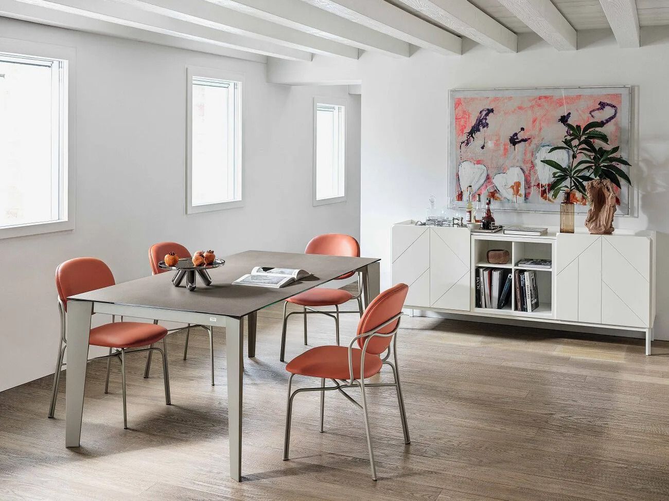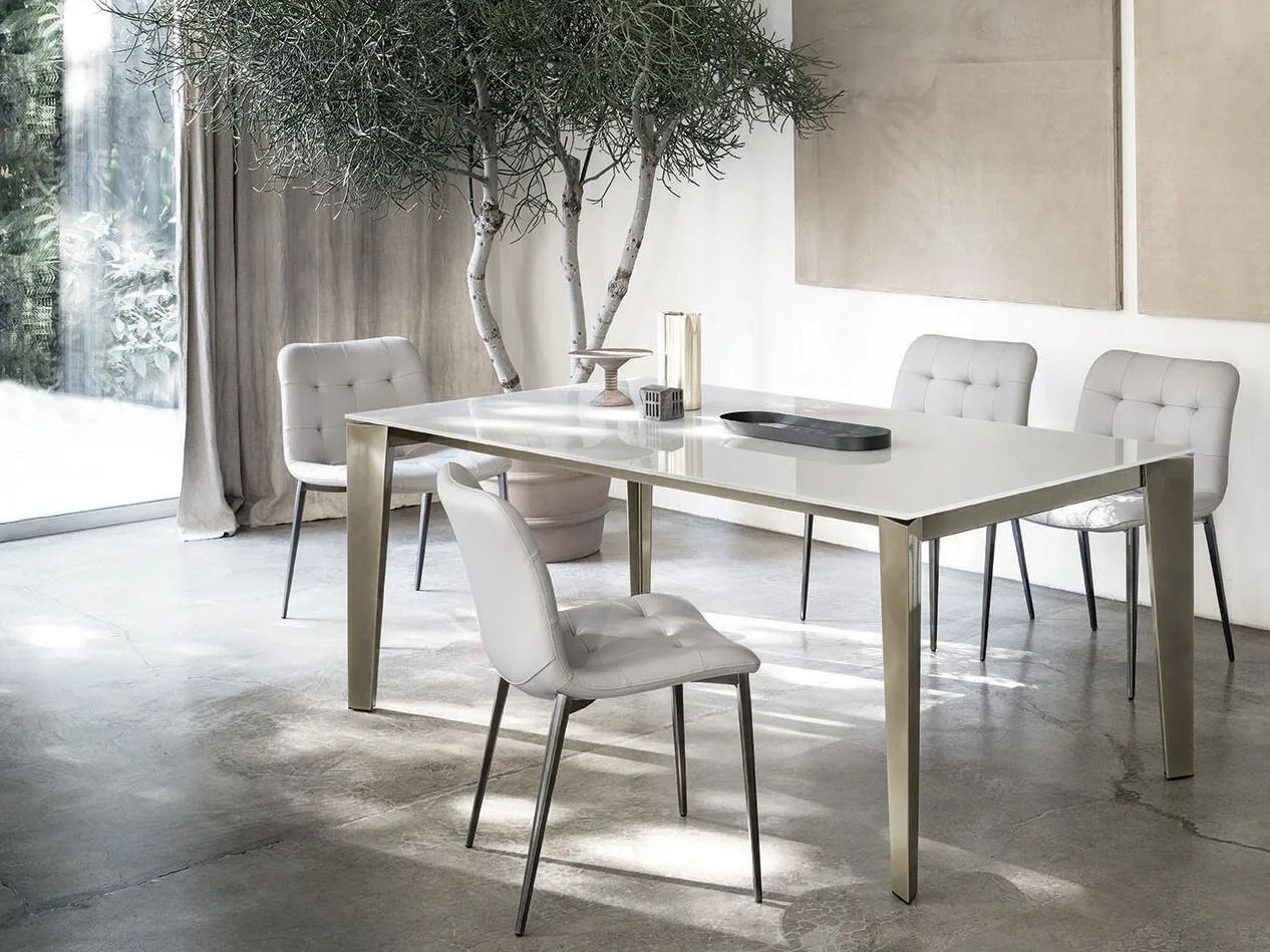 CRUZ is a table with lacquered metal frame. Top in melamine, veener, Glossy glass, Supreme Velvet matt anti-scratch lacquered glass, SuperCeramic or SuperMarble.