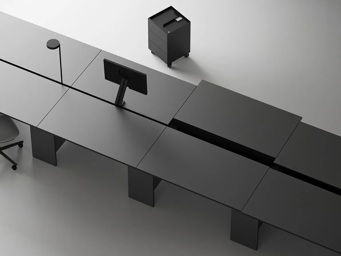 dito is a workbench, based on a simple system of tops, trestles and wooden crossbars. A great range of widths and depths make for an amazing variety of work stations. This product stylishly integrates the key functions of modern desks: cables can be laid through the trestles into the central cable tray and hidden from sight and a sliding tabel top offers easy access to the tray and to the power strip inside. Different types of lamp and screen from other suppliers can also be integrated into the work stations. So handy functions and technology are easy to integrate but theres nothing overtly technical about the dito workbench: minimalist, clean and serenely stylish, it simply takes our design one step further. The dito workbench is made mostly from timber products, opening up infinite design potential: there are a wide range of finish options for the substructure and worktops, from great-value melamine coating to veneer, super-matt and other laminates. We are a wood-working company and are therefore able to meet specific customer and architect requirements.
