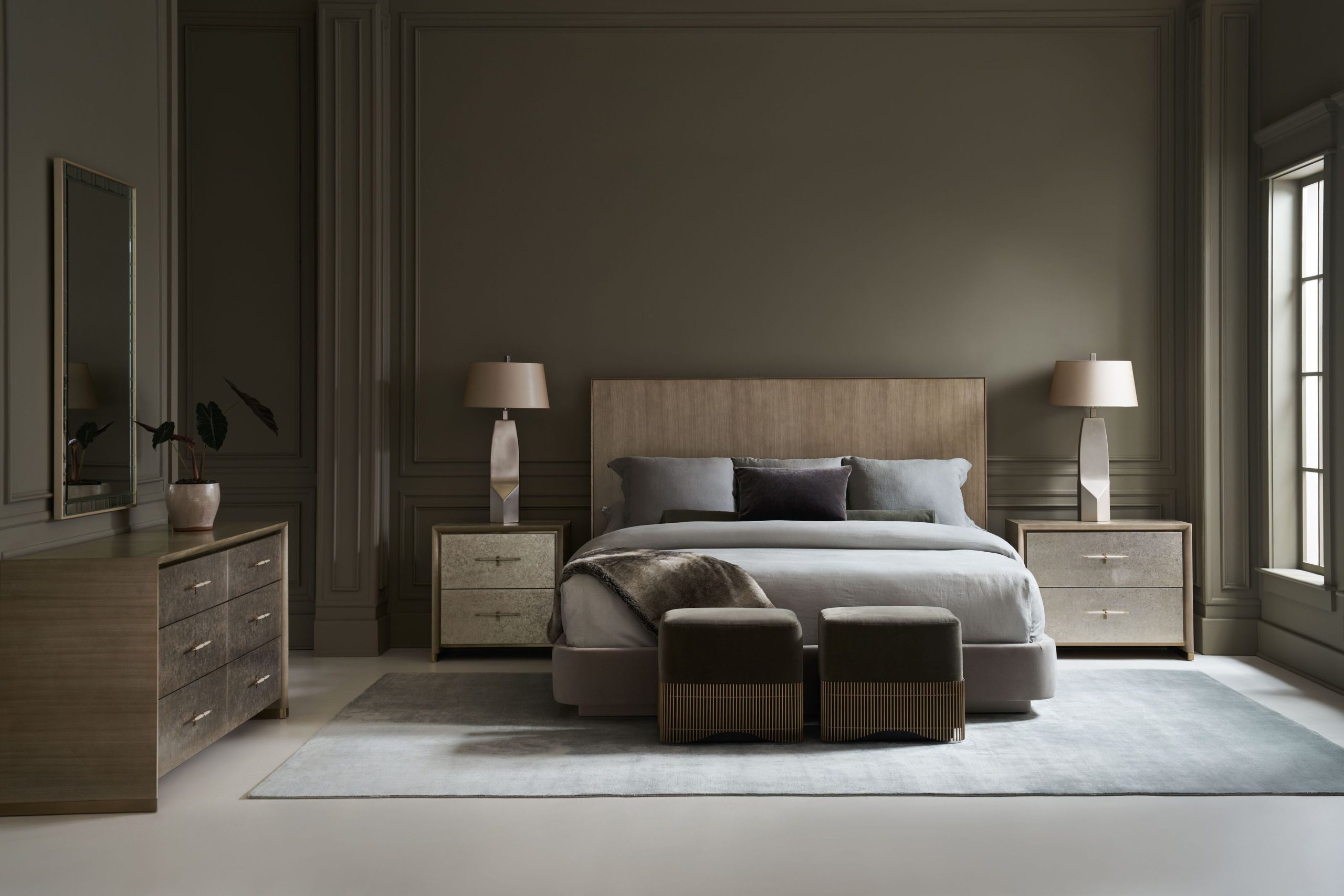 Rich in material, yet restrained in form, the Dream Chaser bed lends an understated balance of opulence and simplicity. A Dry Martini finish draws attention to its parsons-shaped headboard, crafted from exquisite Koto veneers and encased in Brushed Gold. Dressed in a pale gray mohair fabric, a footboard and side rails with gently rounded corners appear to float on a Cloud-painted plinth base. Also available with curved, wood-paneled wings for a more commanding presence.