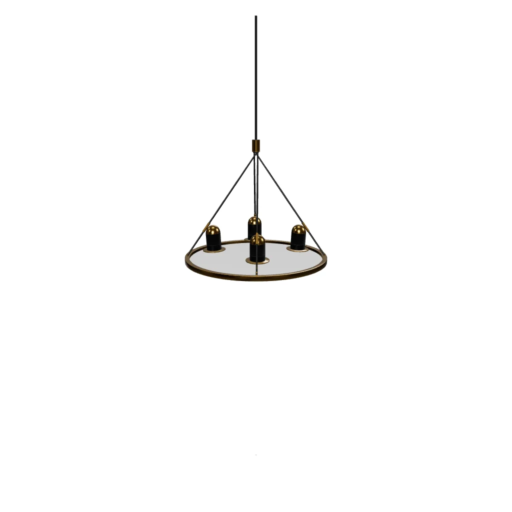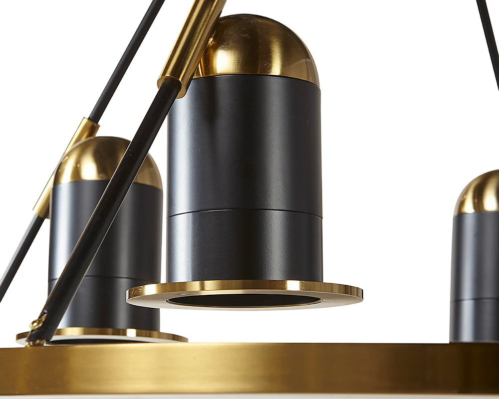 Add drama to any space with this spectacular chandelier. Features four light shades in matte black with antique brass plating, and completed with a large, clear round glass lens.