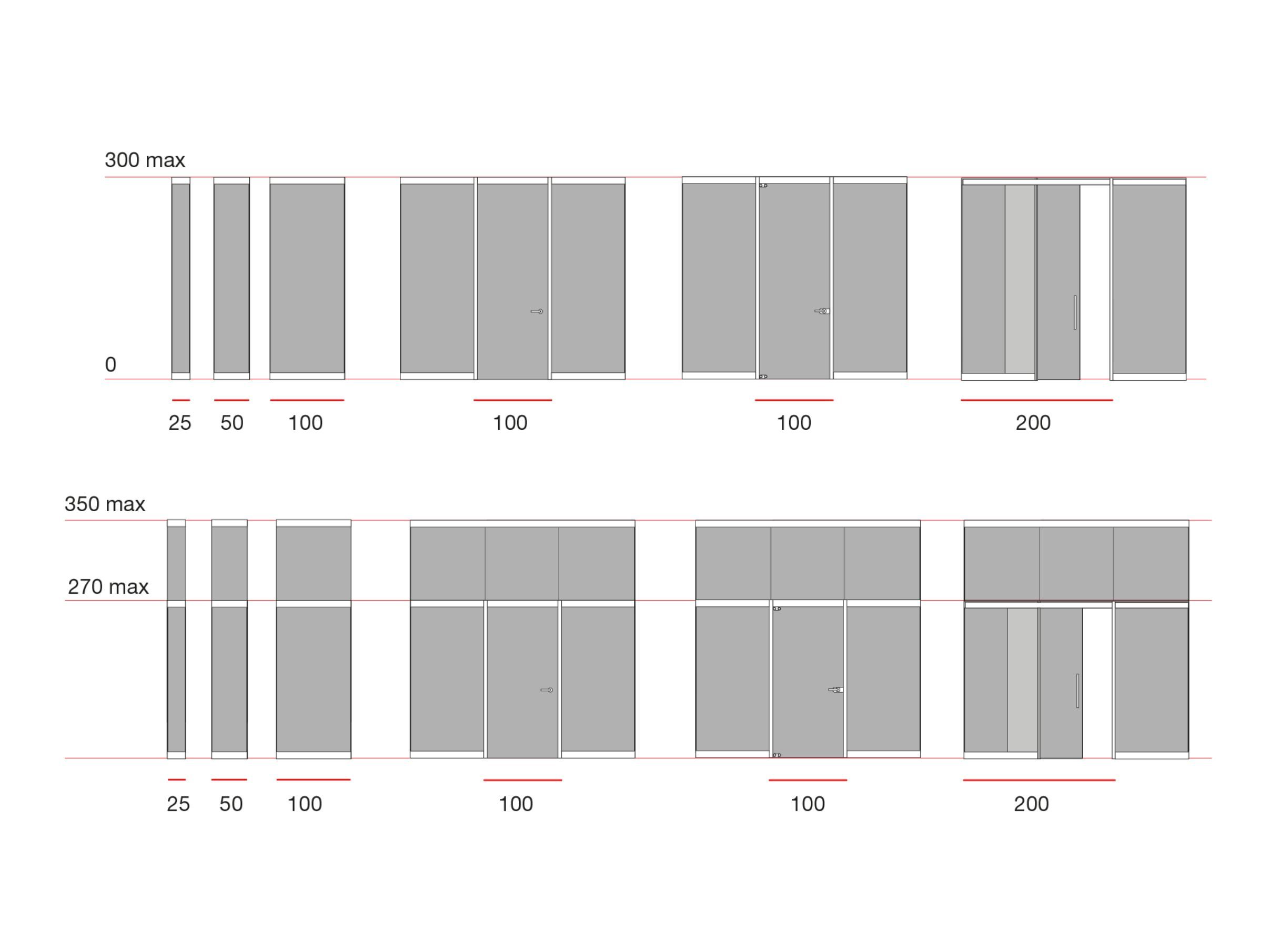The DUO walls, which are 100 mm in thickness, are made of double or single 10mm-thick glass slabs available in tempered and laminated versions with structural and locking functions. The glass fixing function and the floor, ceiling, and wall-leveling operations are all guaranteed by a system of telescopic profiles made of a 10/10 pre-varnished metal guide rail and by aluminum alloy extruded profiles that are used to hold the glass in place from the inside, with glass holders and central and lateral finishing crankcases. The leveling operations are guaranteed by adjustable feet fixed to the lower glass-holding profile, which interacts with the telescopic rail at floor level. The DUO system does not include upper or lateral adjustment panels. Each element is made to measure based on the needs of the building site.