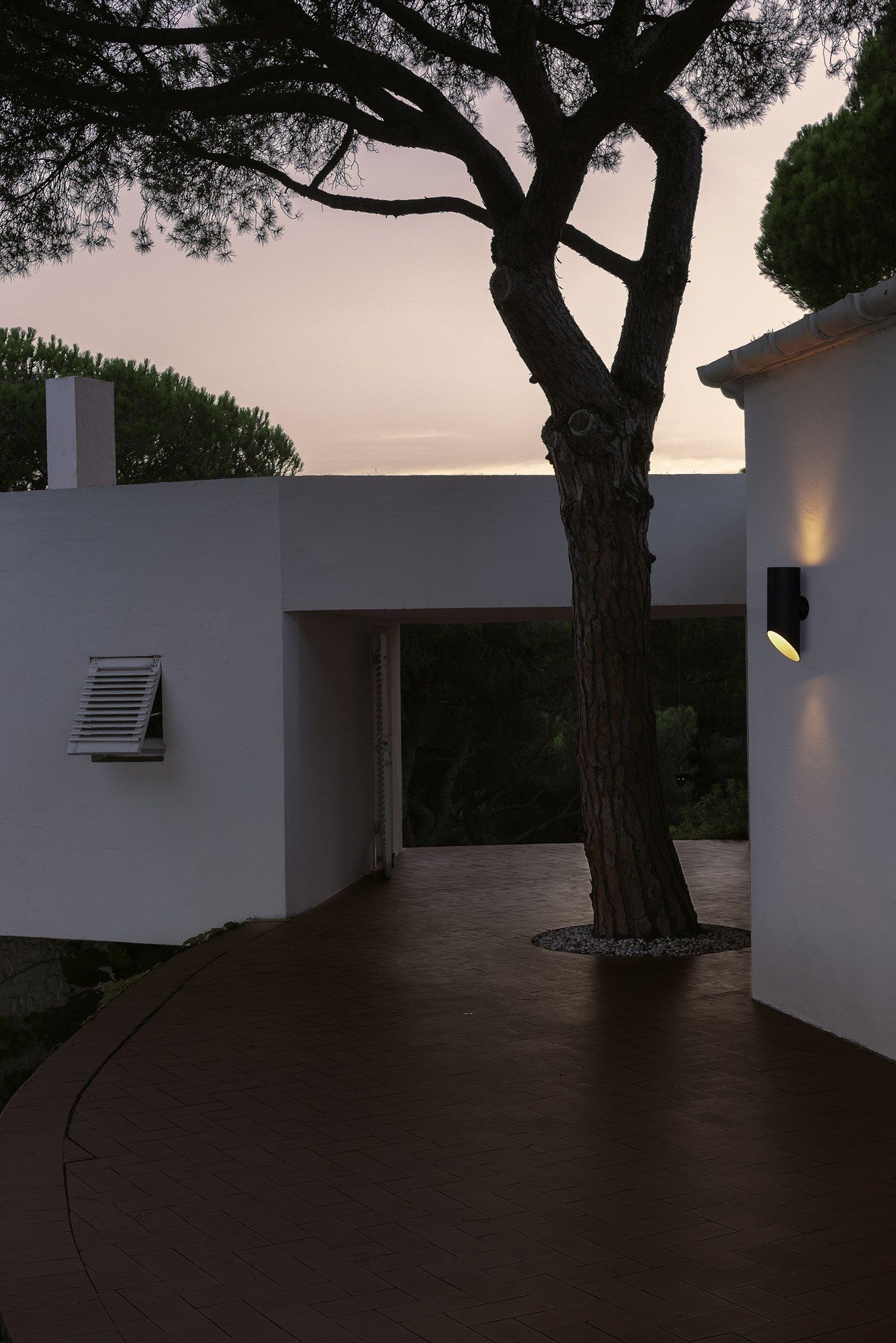 Elipse is an outdoor wall lamp carefully designed for seamless integration with the façade, wall, porch or architecture of which it forms part, exuding a subtle beauty. Understated and discreet, it places the focus on what it illuminates. A simple aluminium tube allows the light to be projected from both its top and bottom.One of the openings features an irregular shape, an aesthetic detail visible when the lamp is off, and that is greatly enhanced when it is on, as a perfect ellipse is traced on the lamp itself and stands out in the midst of the darkness. The other aperture is in a round shape, an unexpected detail that breaks the balance, adding a touch of modernity. It can be installed however one prefers, with the uneven opening upwards or downwards. The interior of the tube is white and, when illuminated, the light grows and comes alive. In the outdoor darkness the lamp itself almost disappears, and all that remains is the light. Available in a single 44-cm size, in graphite grey o brown.