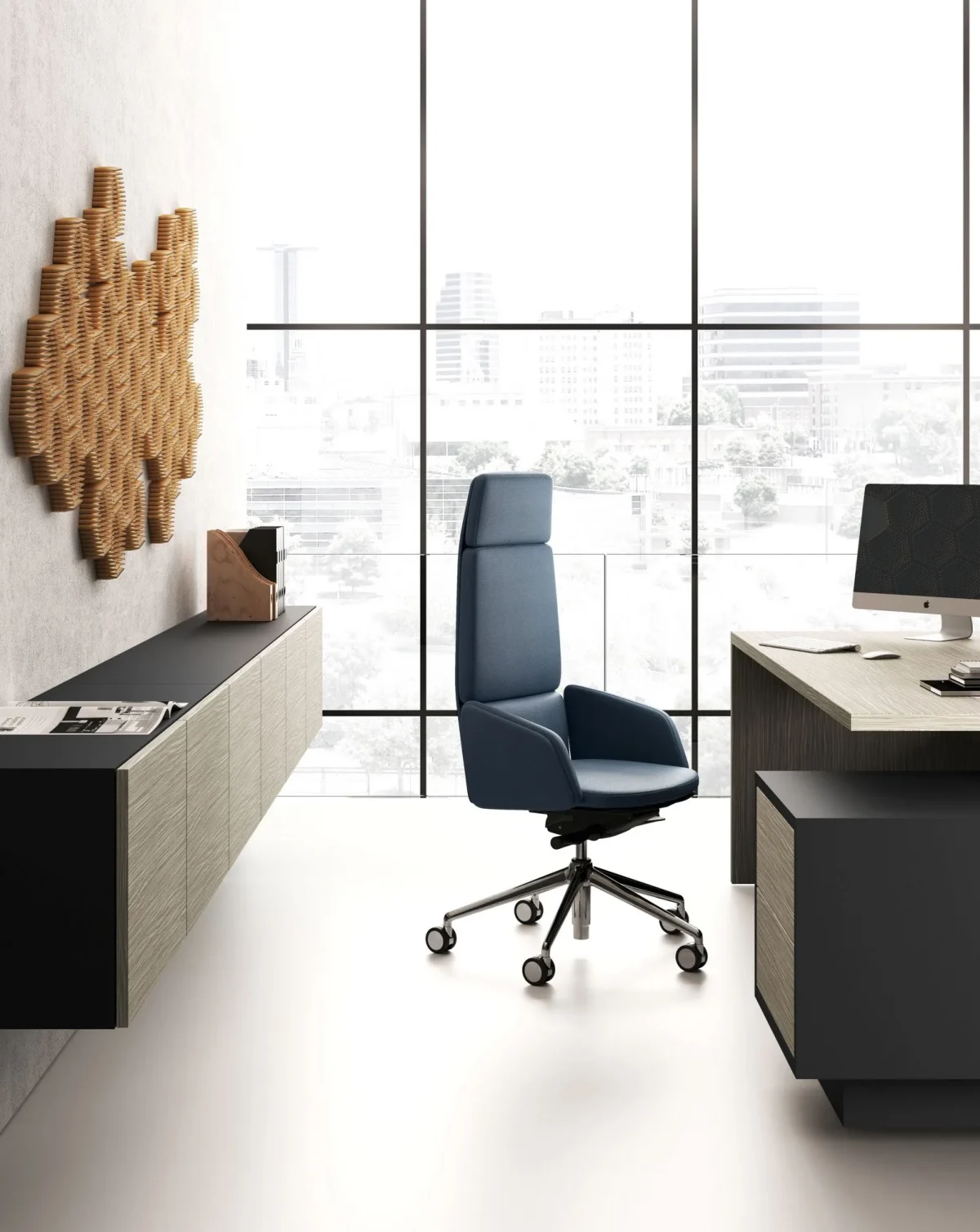 Executive collection where the worktop integrates with the structural base which also has a storage function. The only finishing features are the tops and doors of the drawer unit. A functional workstation embellished by wall panelling with shelves and optional LED lighting.