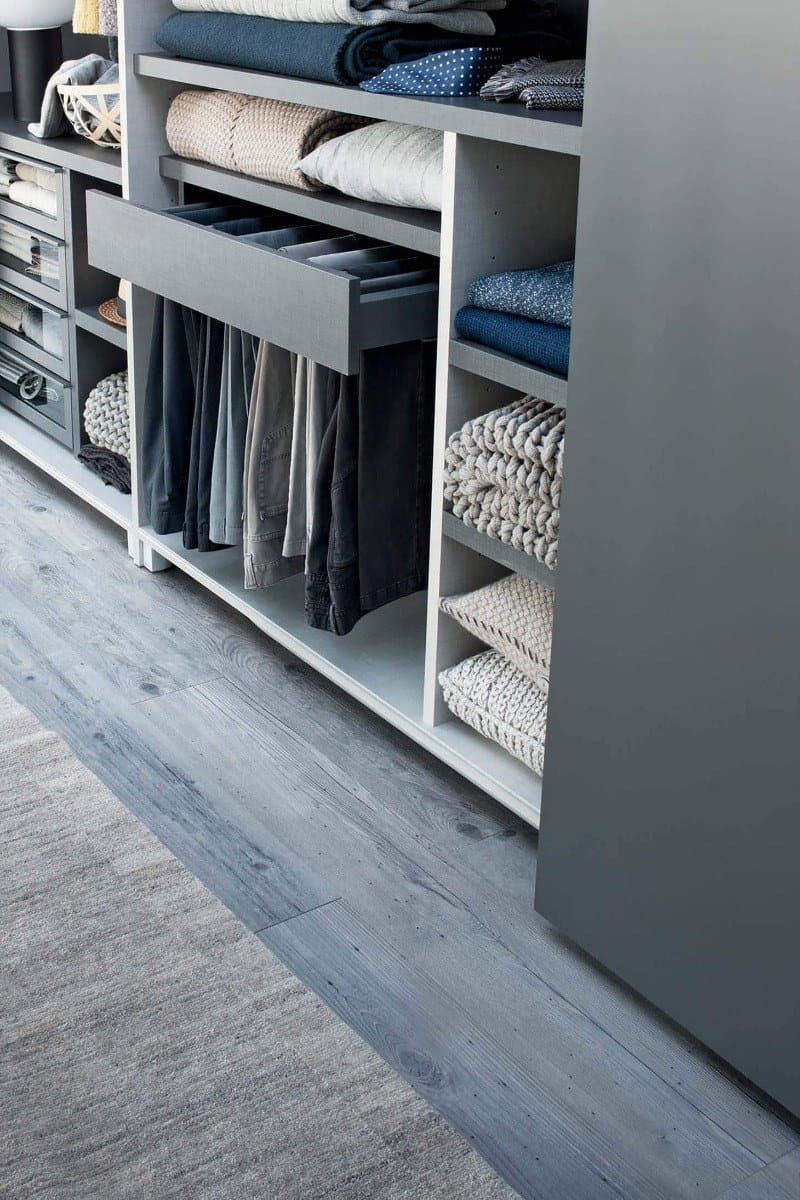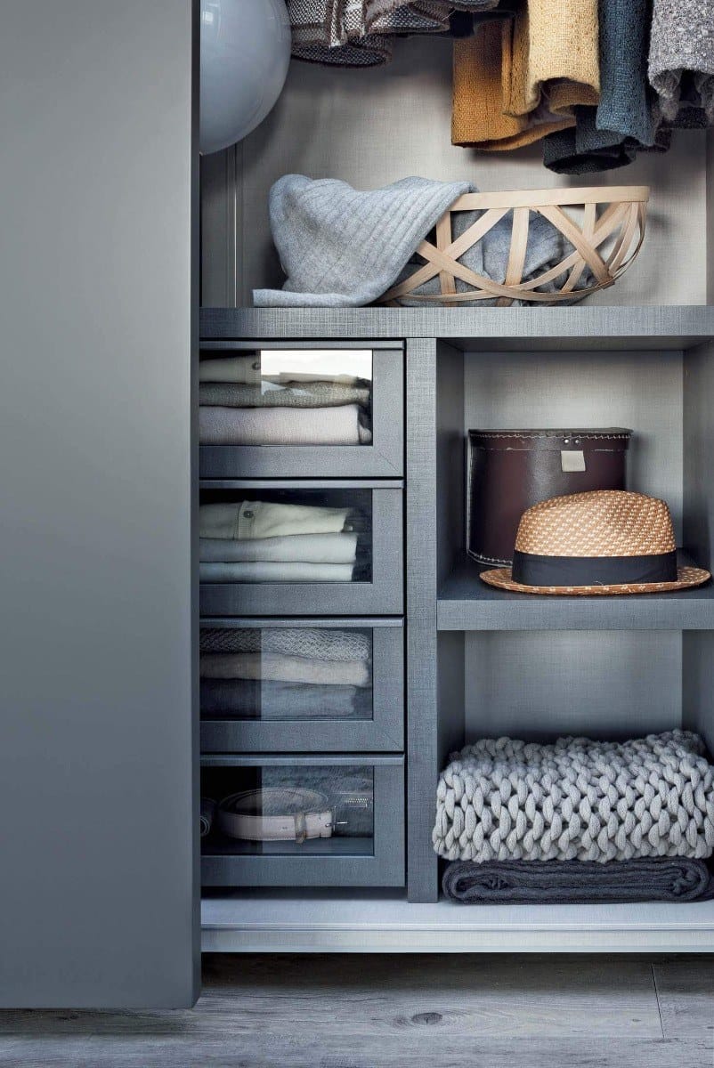 The sophisticated compass opening system means the coplanar doors can be installed in a single line, delivering the aesthetic benefit of a perfectly continuous surface with no protrusions or recesses. There is also plenty of scope to customise the interior: the Armadio al Centimetro programme offers a range of different finishes and stunning features design to allow the space to be adapted to accommodate specific functional requirements. These include drawers, racks for trousers, belts and shoes, shelves and clothes rails with integrated lighting solutions. The wardrobe also offers gorgeous detailing in leather and fabric, such as drawer pads and boxes for shirt racks.