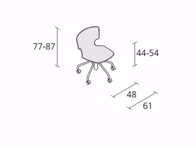 Height adjustable armchair with soft castors and 5-star swivel base in stove enamelled steel. Seat and back in solid plastic material padded with cfc free expanded polyurethane foam, removable cover in fabric, synthetic-leather or in leather. *** available also with hard castors.