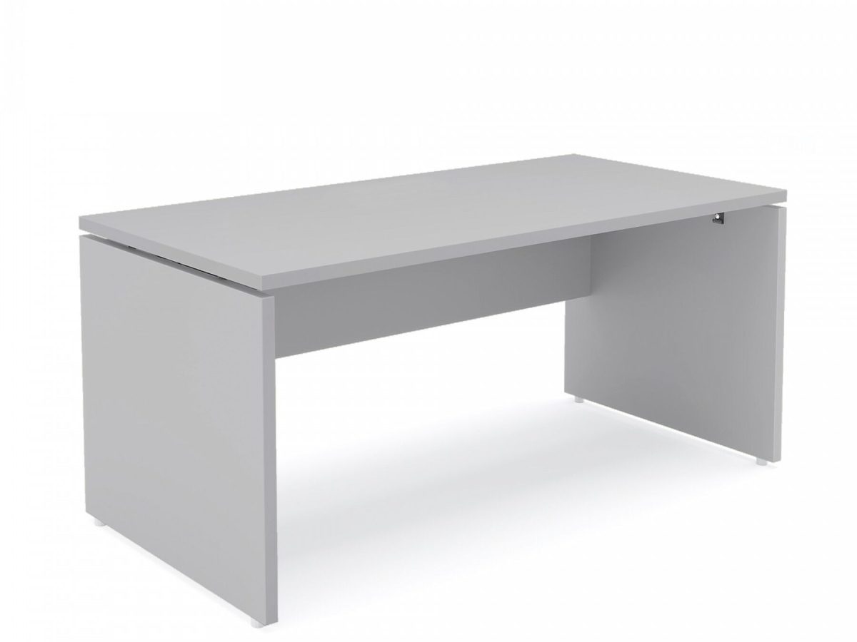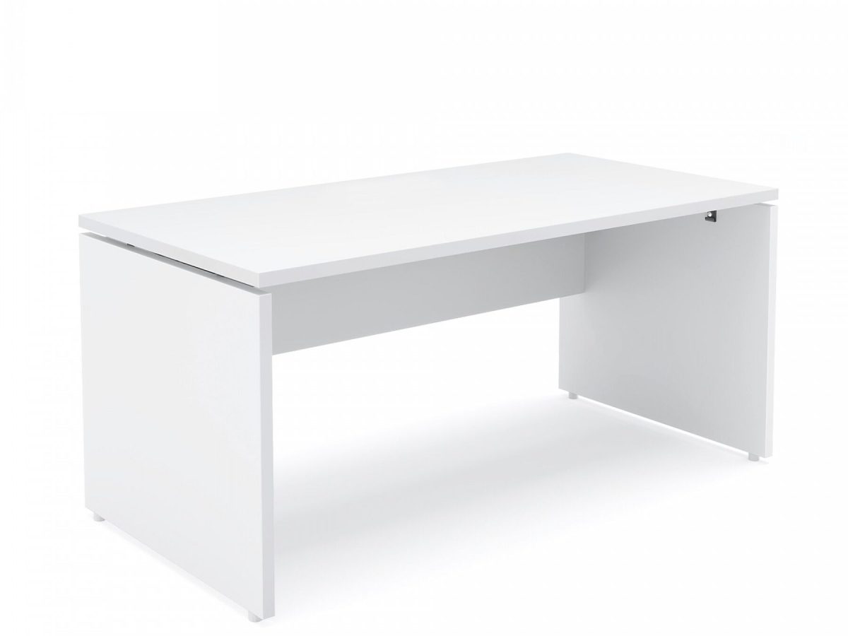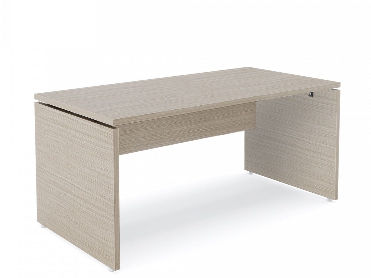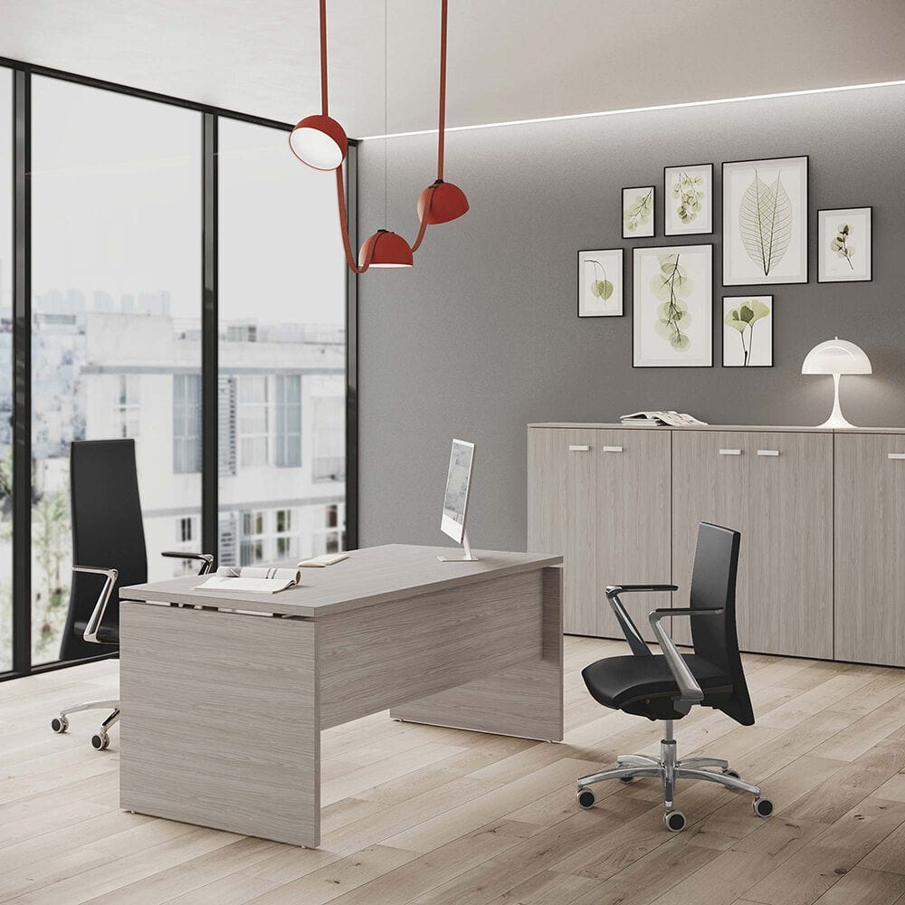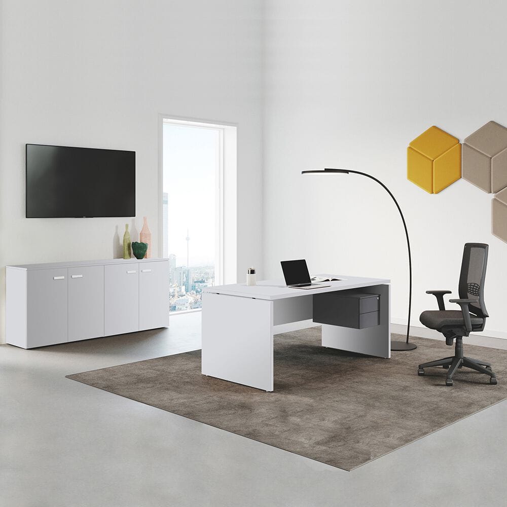 The height of the frontal panel, whether it is made of melamine or of sound-absorbing material, once assembled on the desk is congruent with that of the lateral container with sliding shelf that can be placed next to the worktops with a depth of 80 cm.