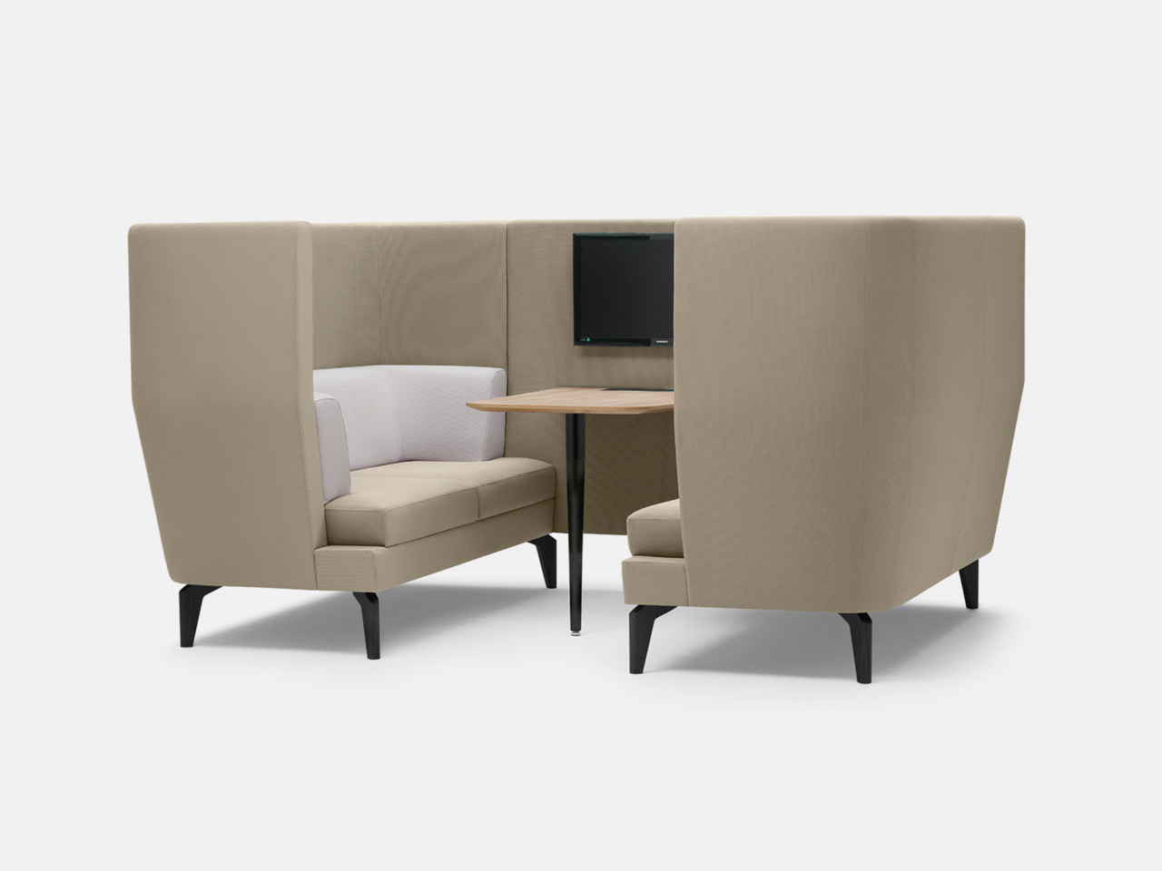 Entente is a distinctive collaborative meeting booth that blends corporate needs with hospitality style. Incorporating power and data cable management provision, this spectacular high booth-and-sofa hybrid features two high-back sofas surrounding the table then wrapped in an elegant interconnecting panel.
