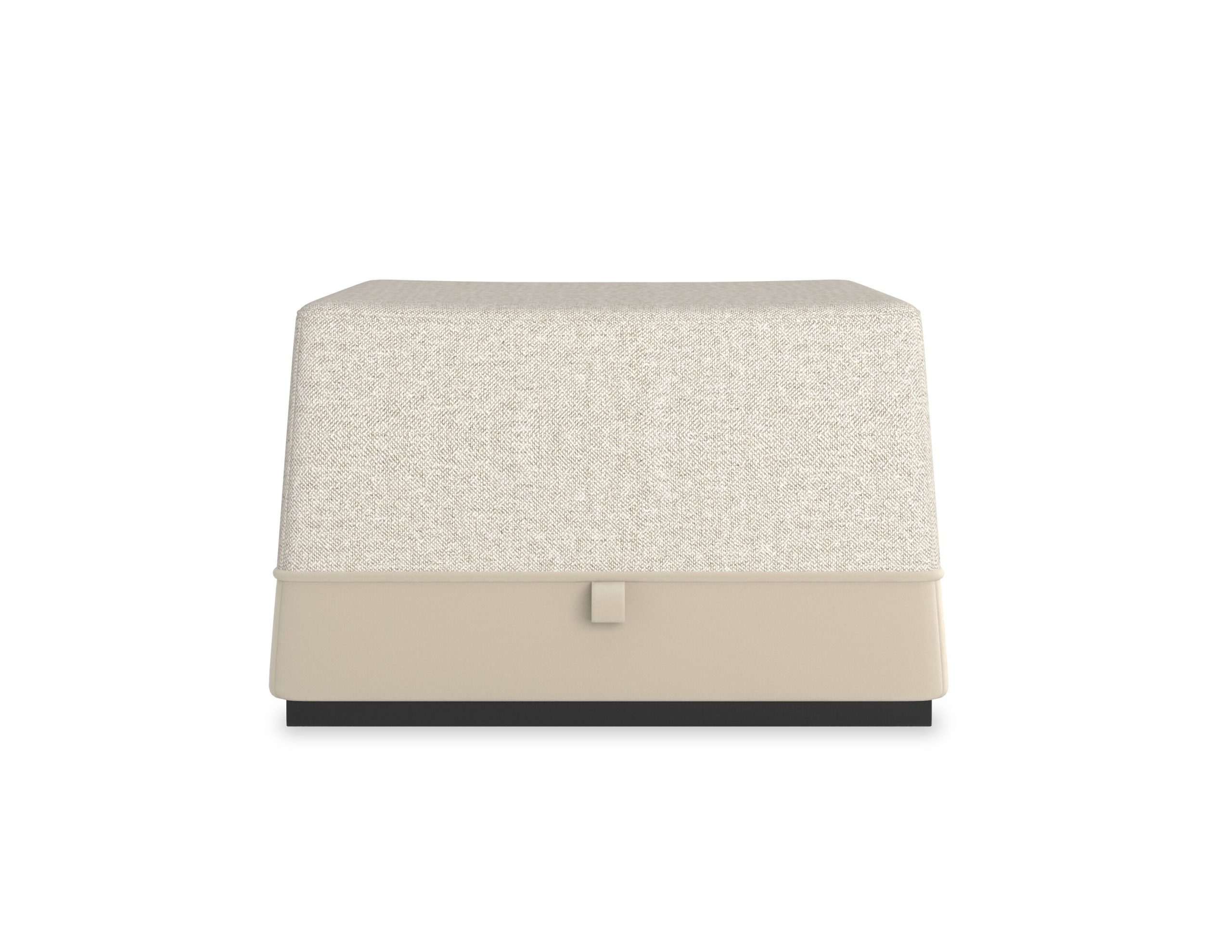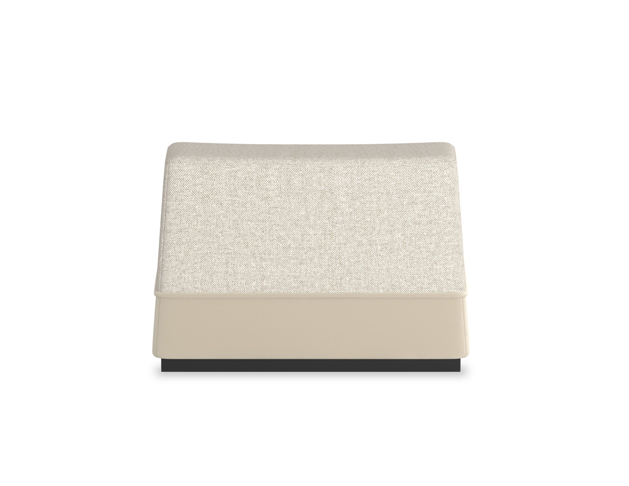 Et Voila is the nesting footrest that accompanies the Et Voila Chair. This perfectly proportioned piece is smartly upholstered in a light, Mottled Grey tweed with a base of Pumice Performance Suede. The piece rests on a wooden base in Dark Chocolate.