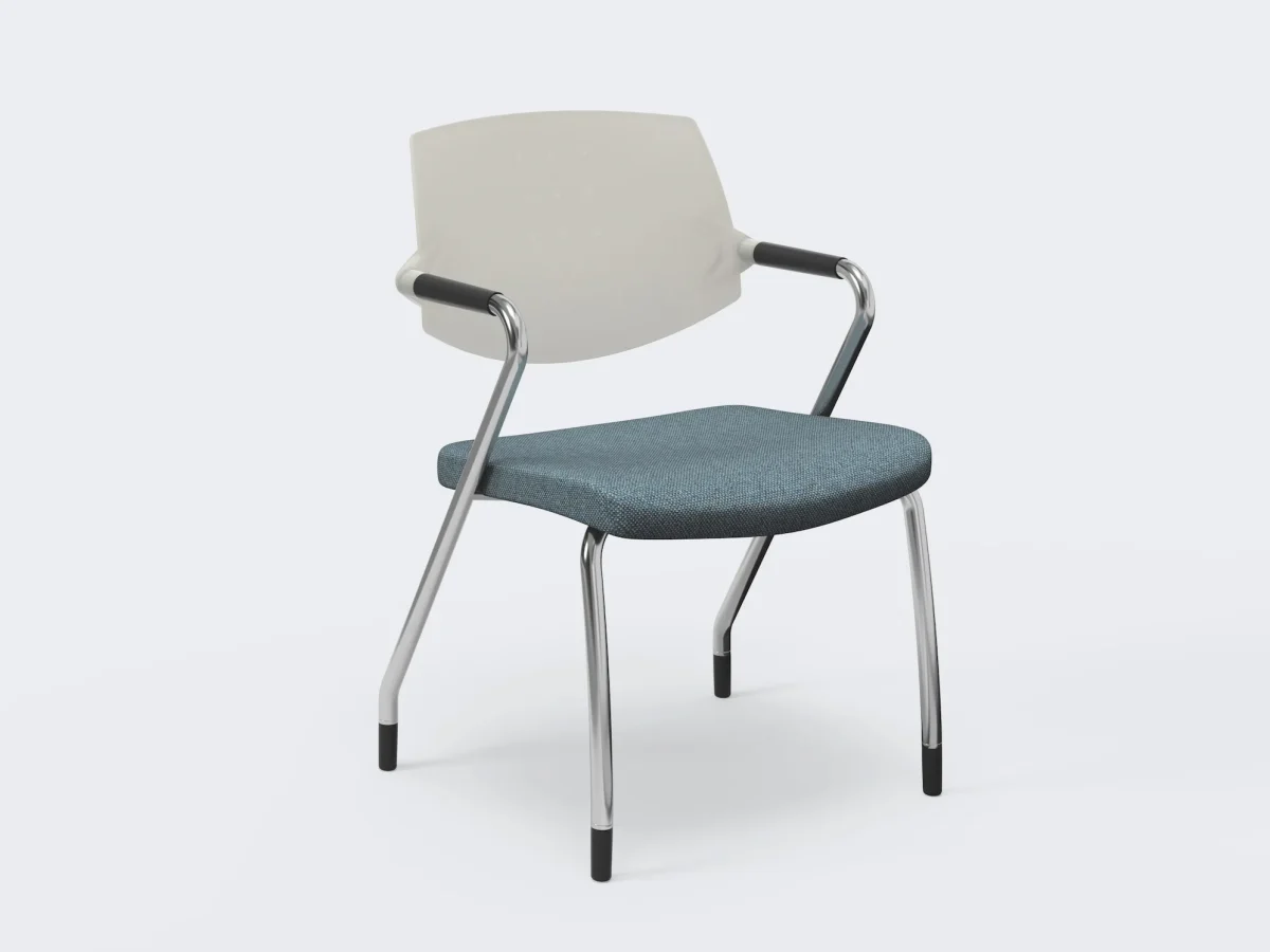 All models: seat in natural beech plywood padded and upholstered, with padding in self-extinguishing shape-retaining synthetic foam. Supporting frame in asform tubular steel chromed or epoxy powder coated. Armrests upholstered in soft touch elastomer.