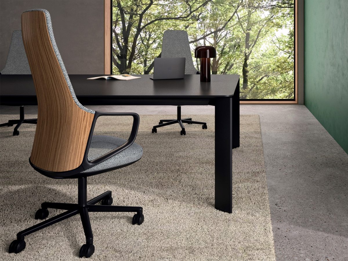 The Extra range has been extended with the addition of Extra Table Conference, in which the sizes of the tabletops have increased, intermediate legs are added to create long continuous table solutions and a new base option with a cylindrical leg is incorporated, where the rectangular top has rounded corners to adapt to this leg. All this boosts its versatility and possibilities in corporate environments and transcends the concept of a configurable table with connectivity and multimedia options integrated into its structure.