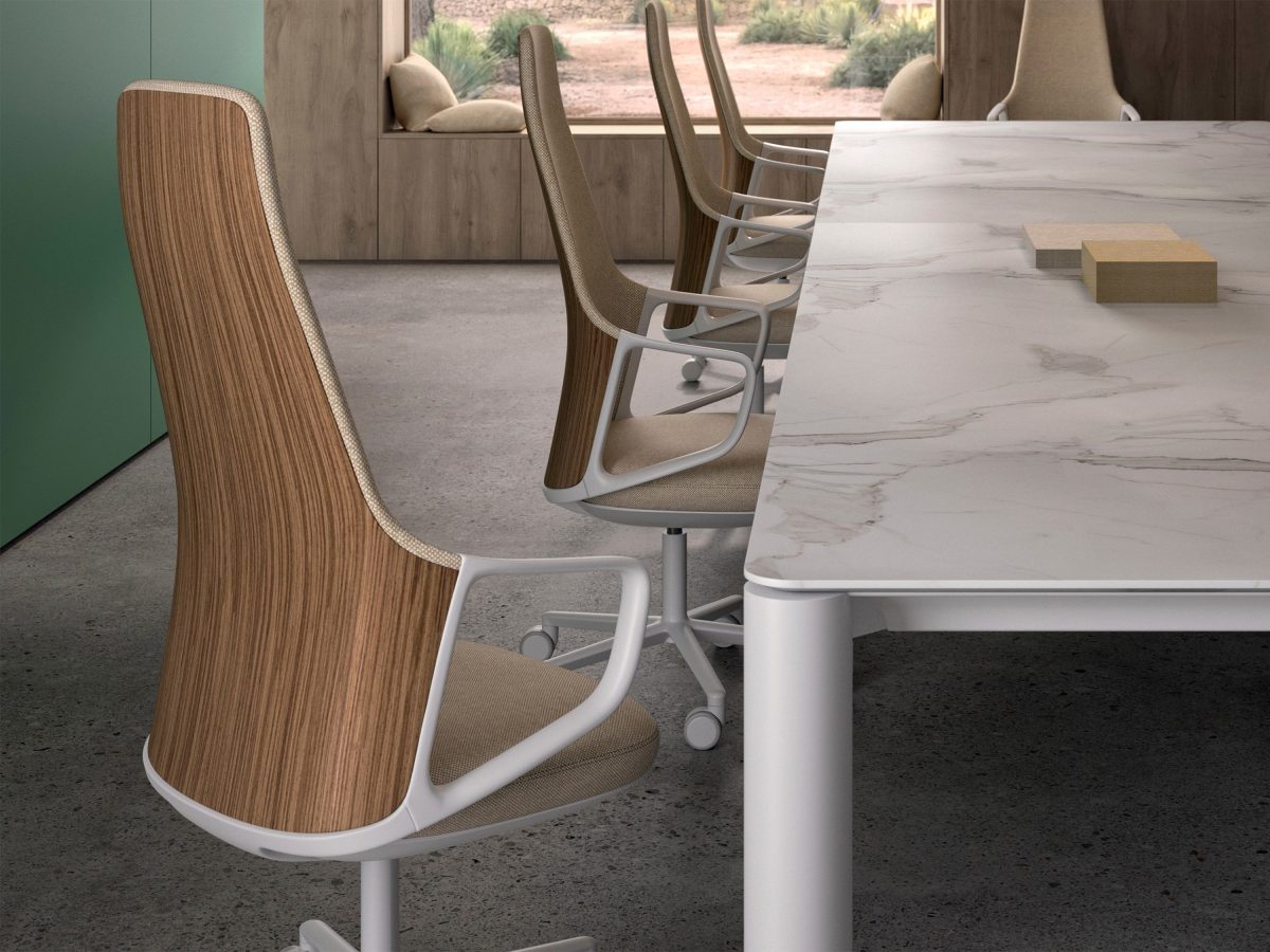 The Extra range has been extended with the addition of Extra Table Conference, in which the sizes of the tabletops have increased, intermediate legs are added to create long continuous table solutions and a new base option with a cylindrical leg is incorporated, where the rectangular top has rounded corners to adapt to this leg. All this boosts its versatility and possibilities in corporate environments and transcends the concept of a configurable table with connectivity and multimedia options integrated into its structure.