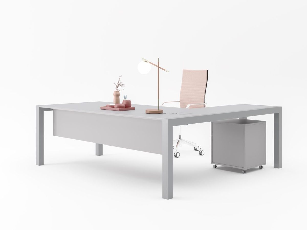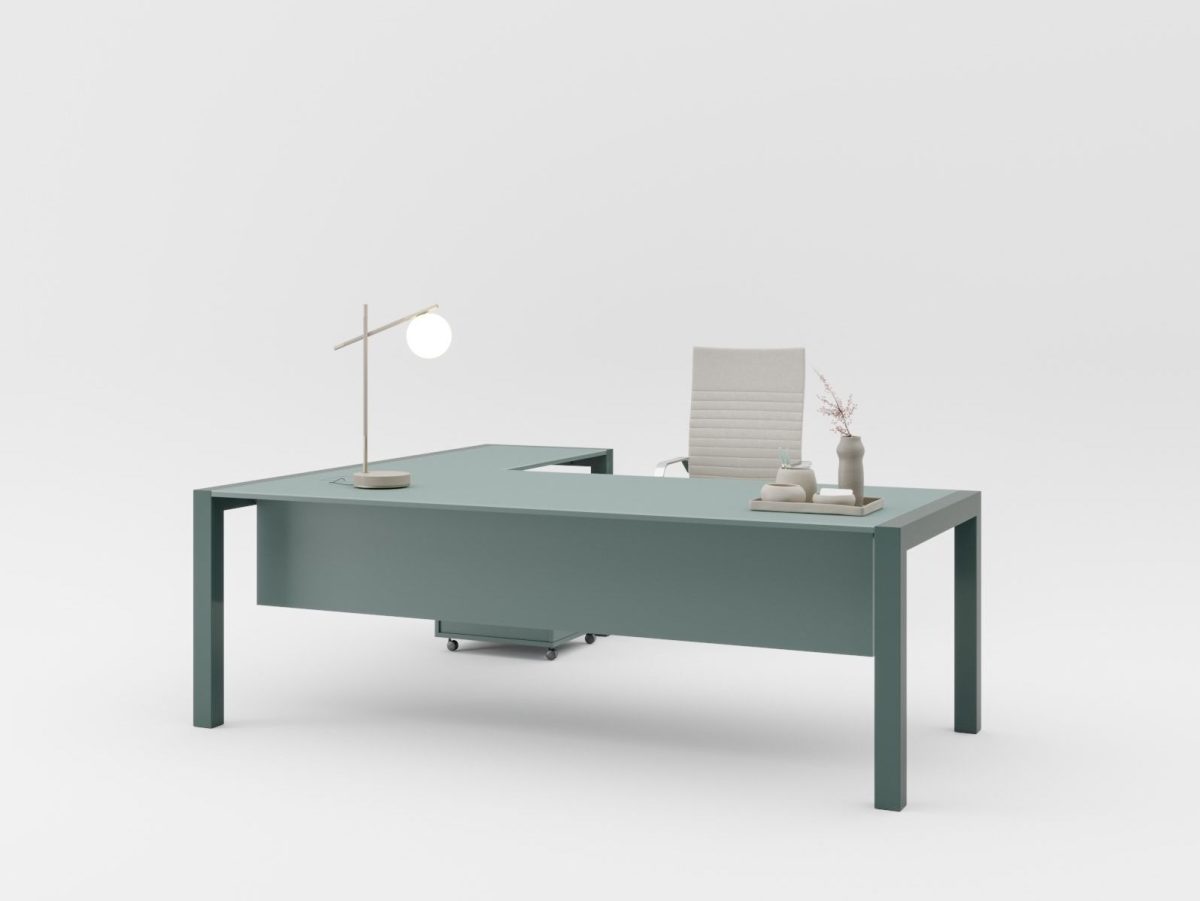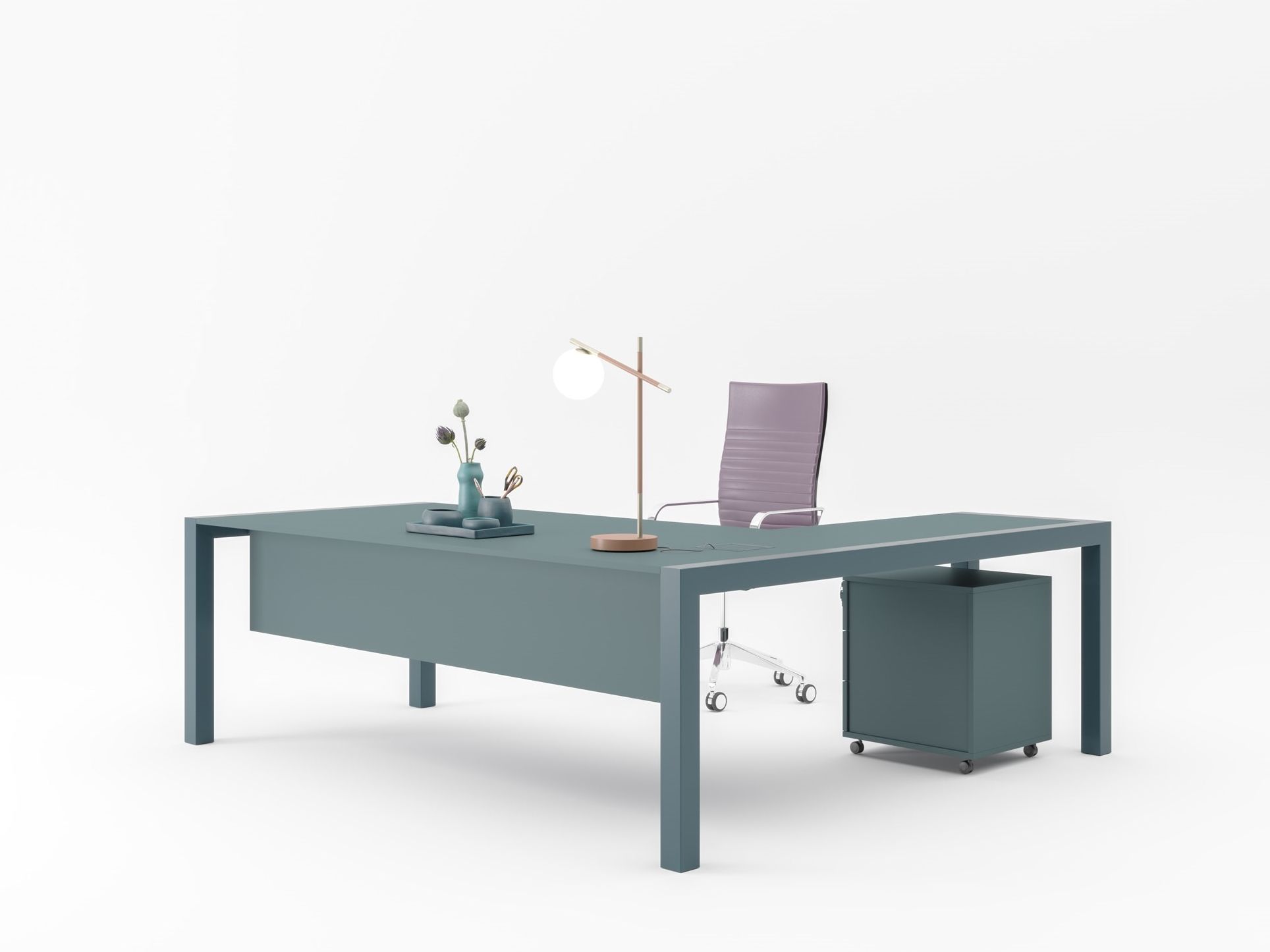 Simple and versatile, Extralight is a collection of desks and meeting tables characterized by an essential metal structure and a light top, which fits easily into different work environments. Rich is the proposal of materials and finishes, with coordinated shades on all surfaces. It is infact possible to choose one color for the top and the structure or a mix of colors in perfect color combination. The top can be in melamine wood, anti touch lacquered glass, brilliant and marble effect, Fenix NTM and veneered wood. The structure is matt painted in the entire range of colors in the catalogue. The desk is offered with or without a modesty panel in a simple version, with an extension, on a modular unit and on a sliding unit.