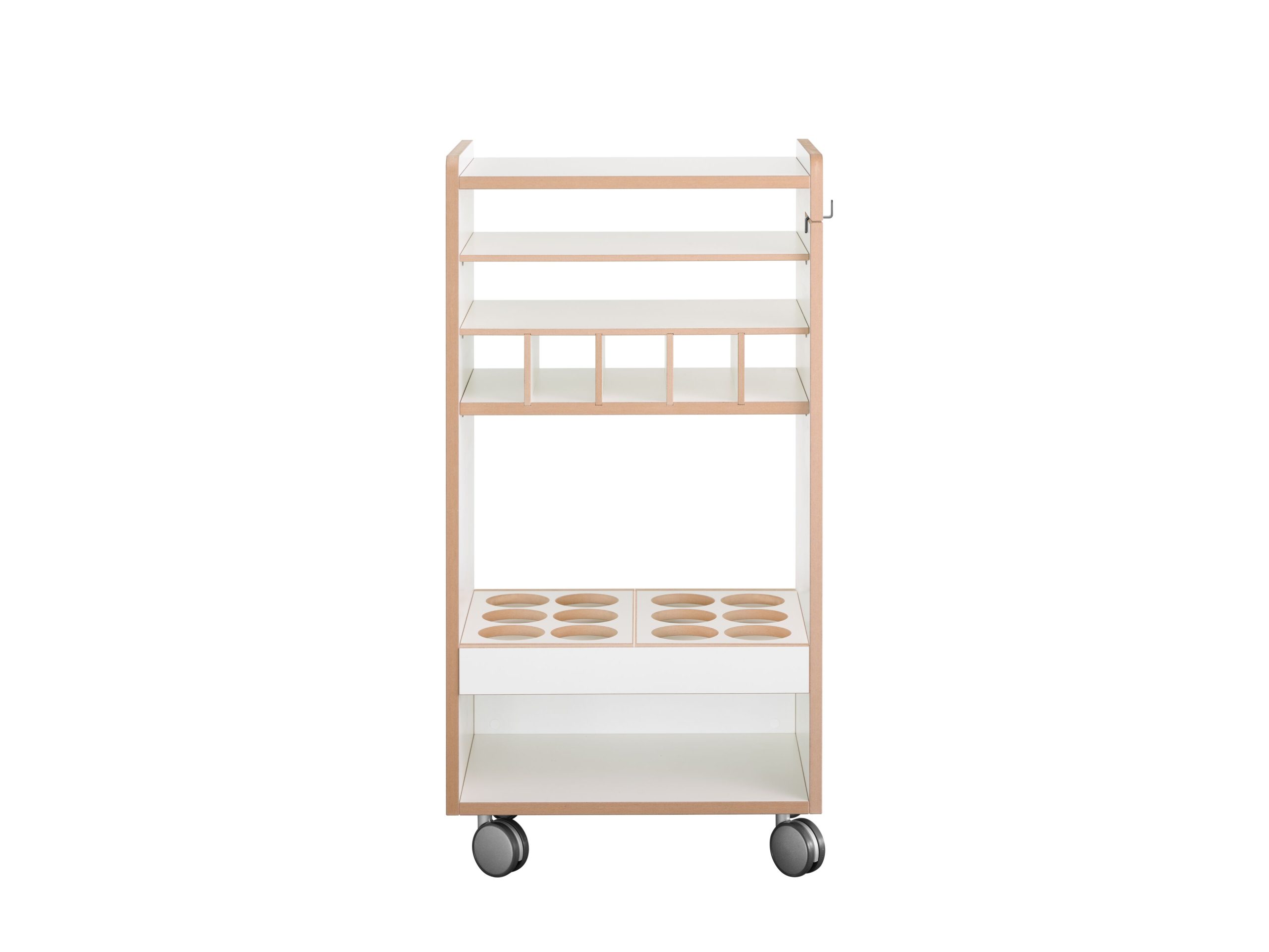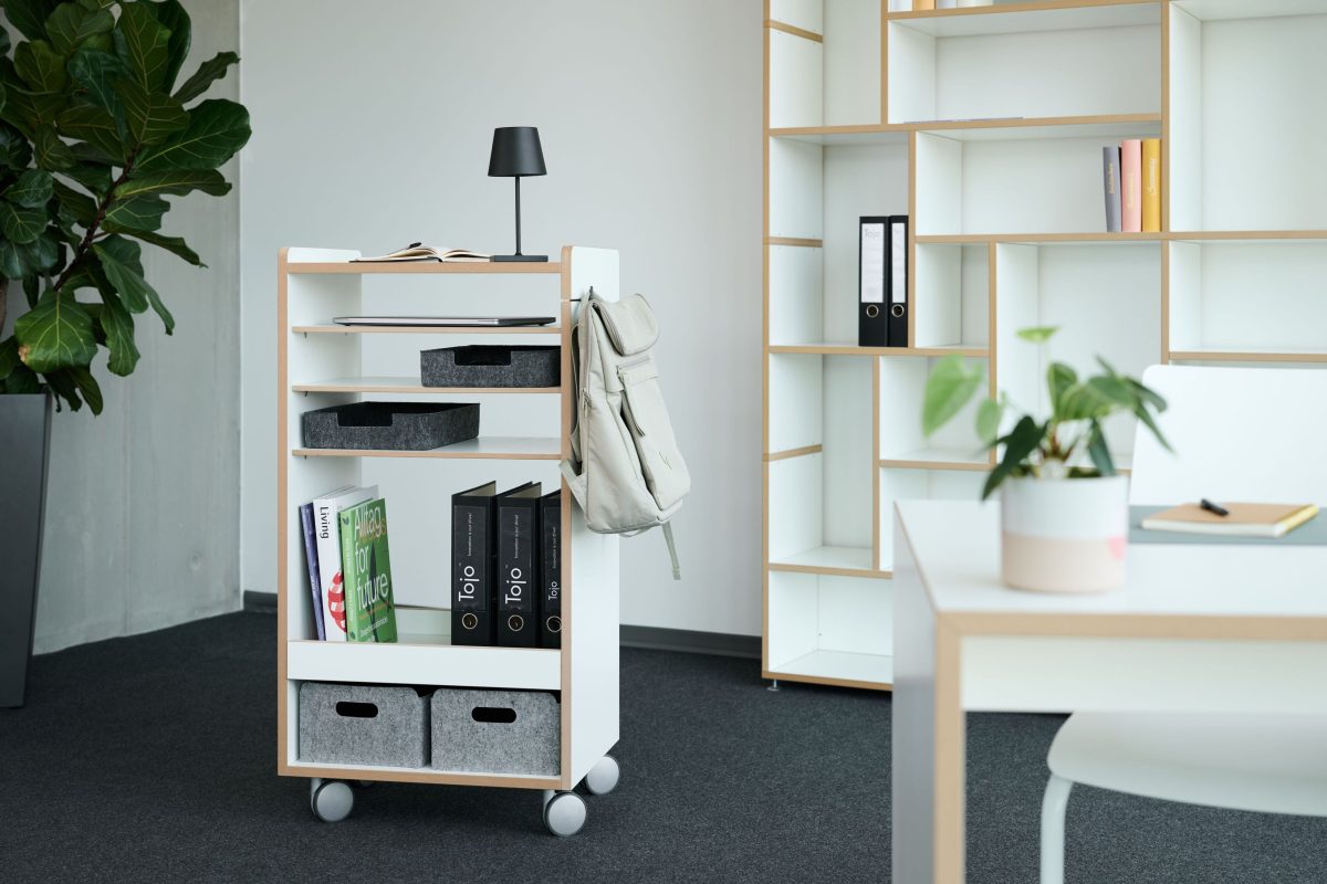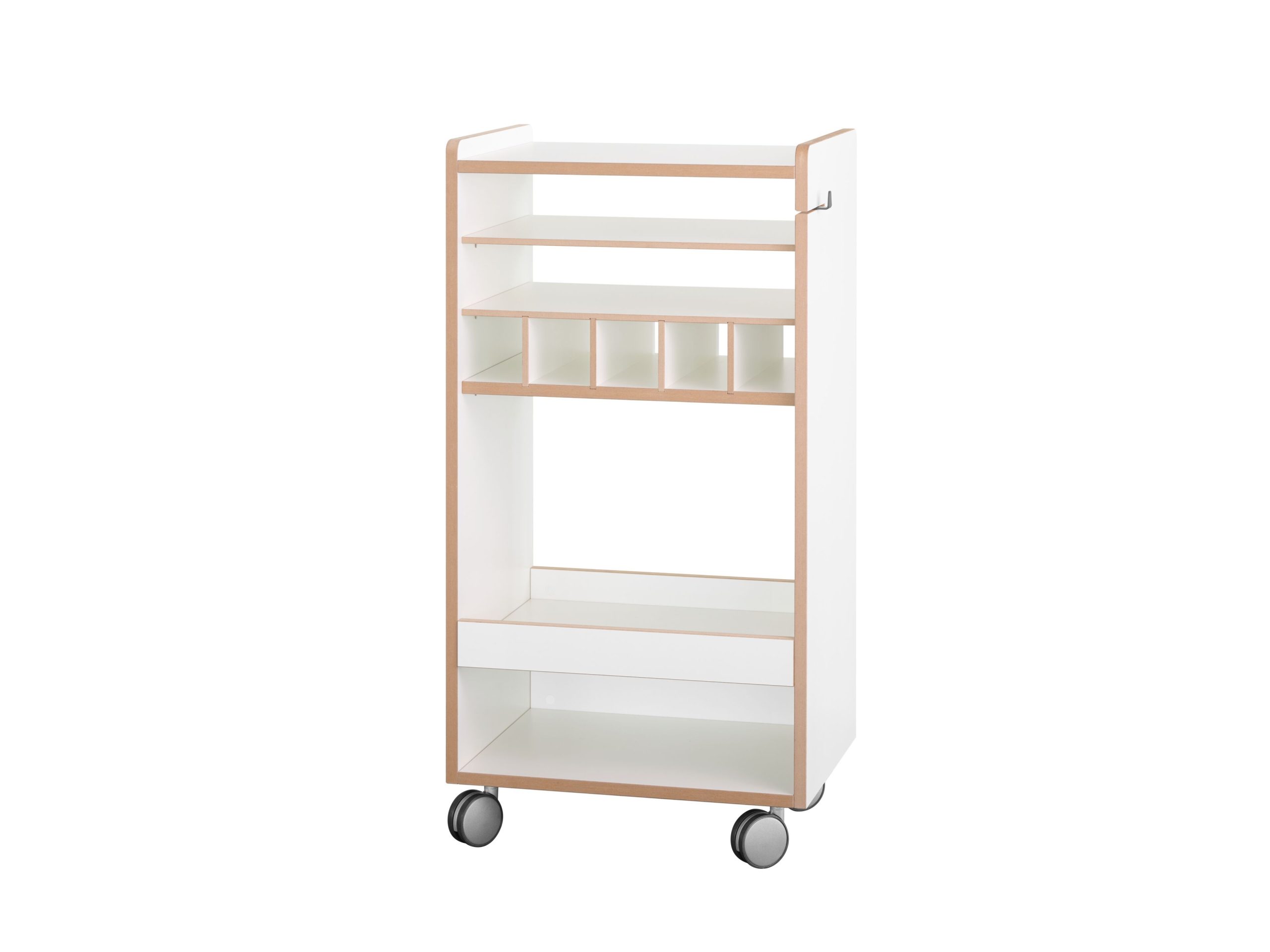 FAHRBAR is a storage unit made of white MDF on wheels with flexible use.