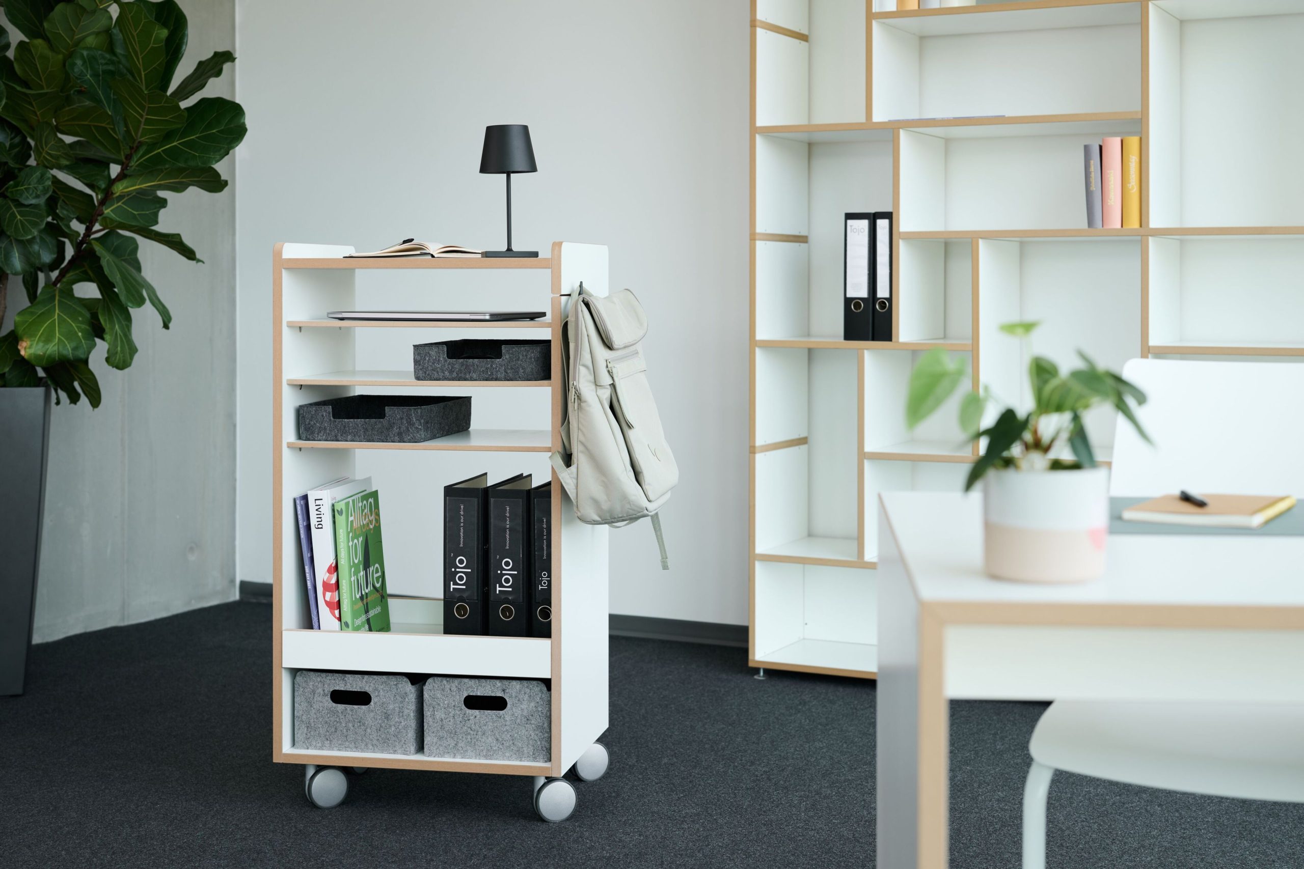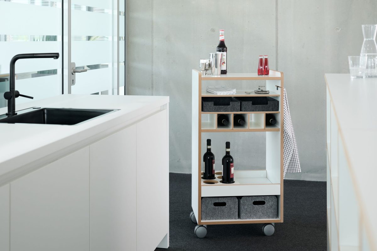 Tojo-fahrbar is also perfect as a bar unit in the version with space for bottles, glasses, and accessories. Many storage options for baskets, boxes, and cardboard boxes are added. There is a practical hook on the side that can be used to hang tea towels as well as cables or headphones.