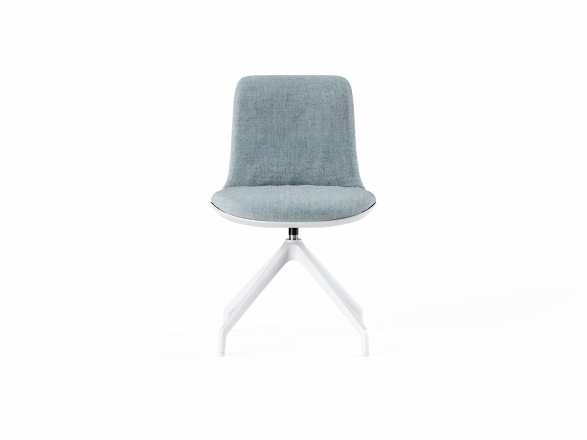 Fior di Loto is a multipurpose chair with unibody frame made of fire-retardant, cold-foamed flexible polyurethane with tubular steel insert. Characterised by a backrest cover in white Baydur plastic material, the monocoque is upholstered at the front and is available with or without armrests. The swivel chair has a 4-spoke pyramid base, available in polished aluminium or white nylon.
