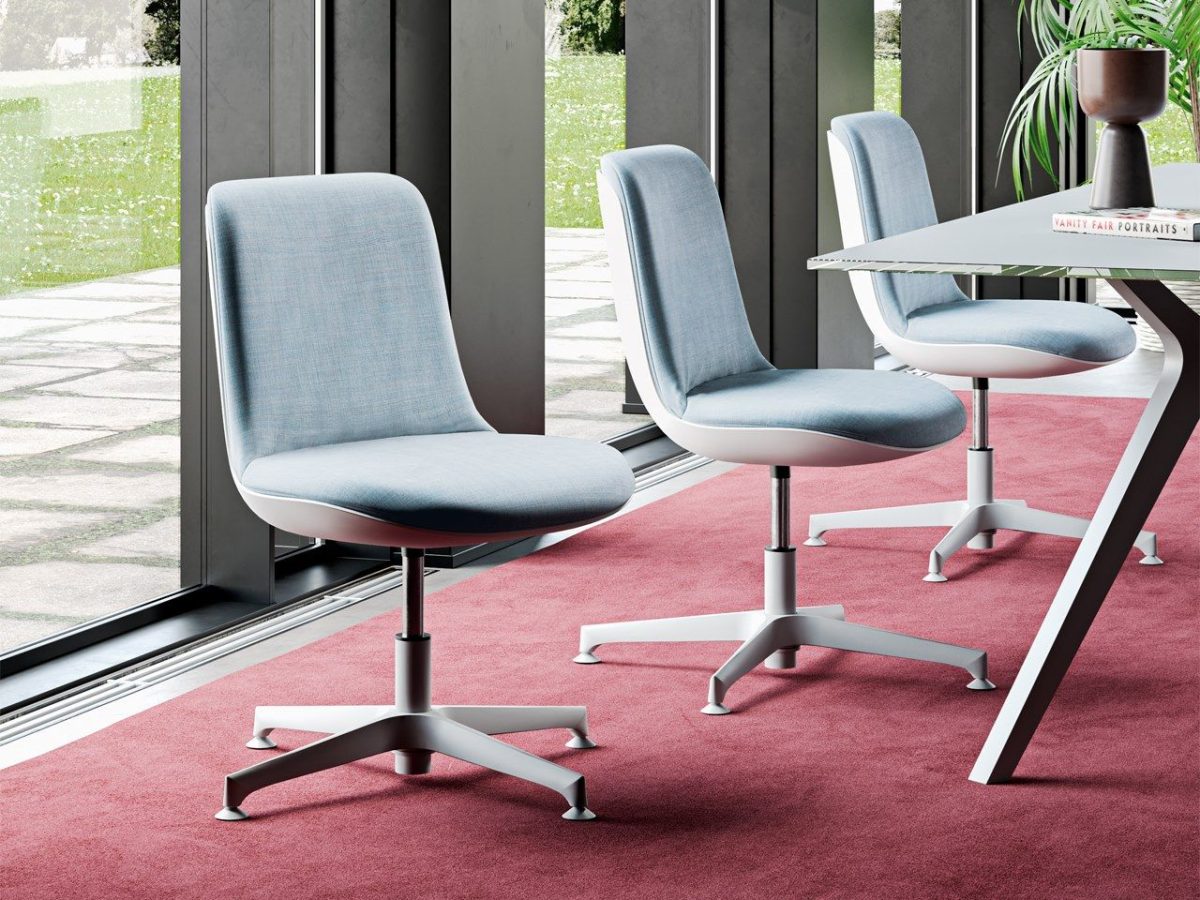 This collection ensures great comfort thanks to its soft padding. Fior di Loto is available with and without armrests, fully upholstered or with a Baydur plastic covered backrest. The numerous bases – on castors, with feet, pyramidal or wooden – allow the collection to adapt naturally to different environments, ranging from the office to one’s home.