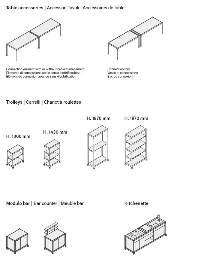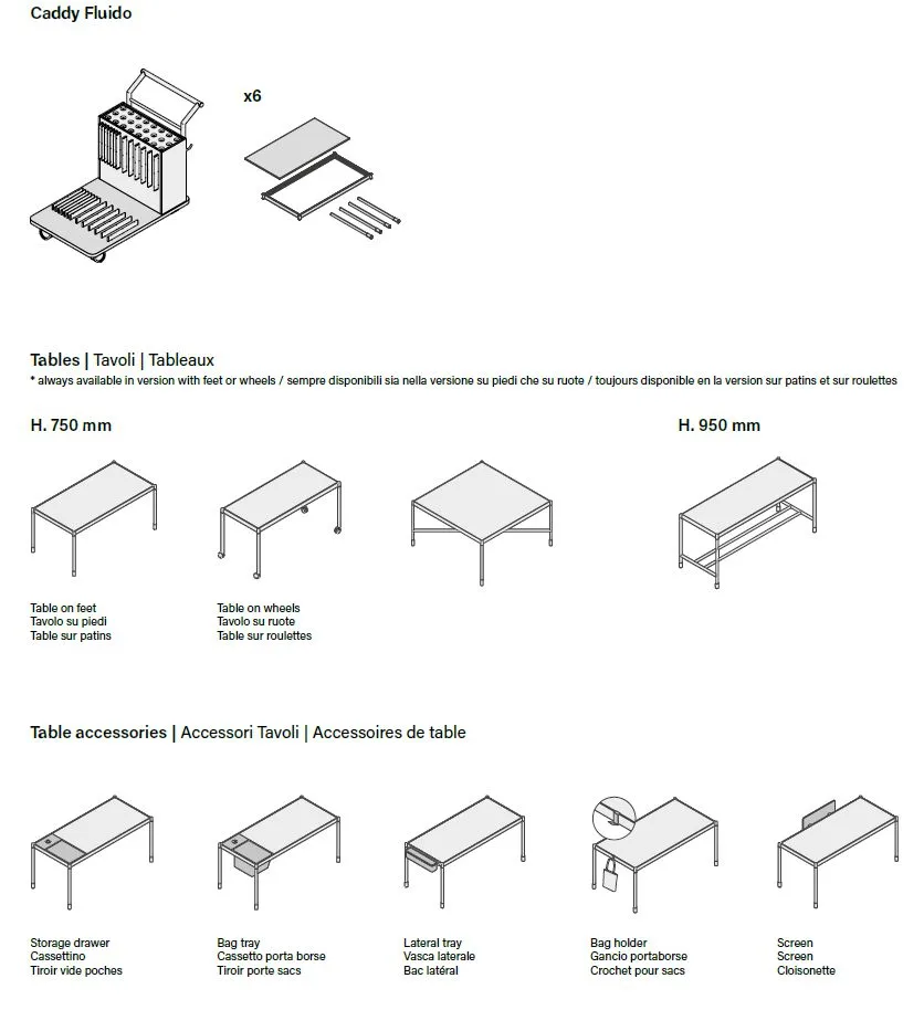 Fluido is a programme that allows you to create completely modular, customisable and flexible environments. All imaginable ways of furnishing increasingly hybrid spaces become reality with Fluido. The system is composed through a new concept of assembling structures, creating infinite solutions: tables, bookcases, trolleys up to compact modular kitchens fit for any place; at home as well as in the office, in public and private areas, formal and informal, for outdoor or indoor spaces.