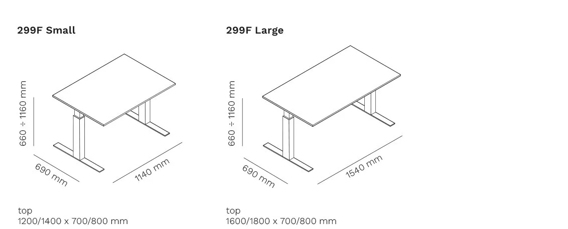 The table frame (1140×690 mm for 299F Small and 1540×690 mm for 299F Large) is designed for optimal operation within a weight range (top weight + accessory weight) between 23 and 31 kg for 299F Small and between 30 and 38 kg for 299F Large.