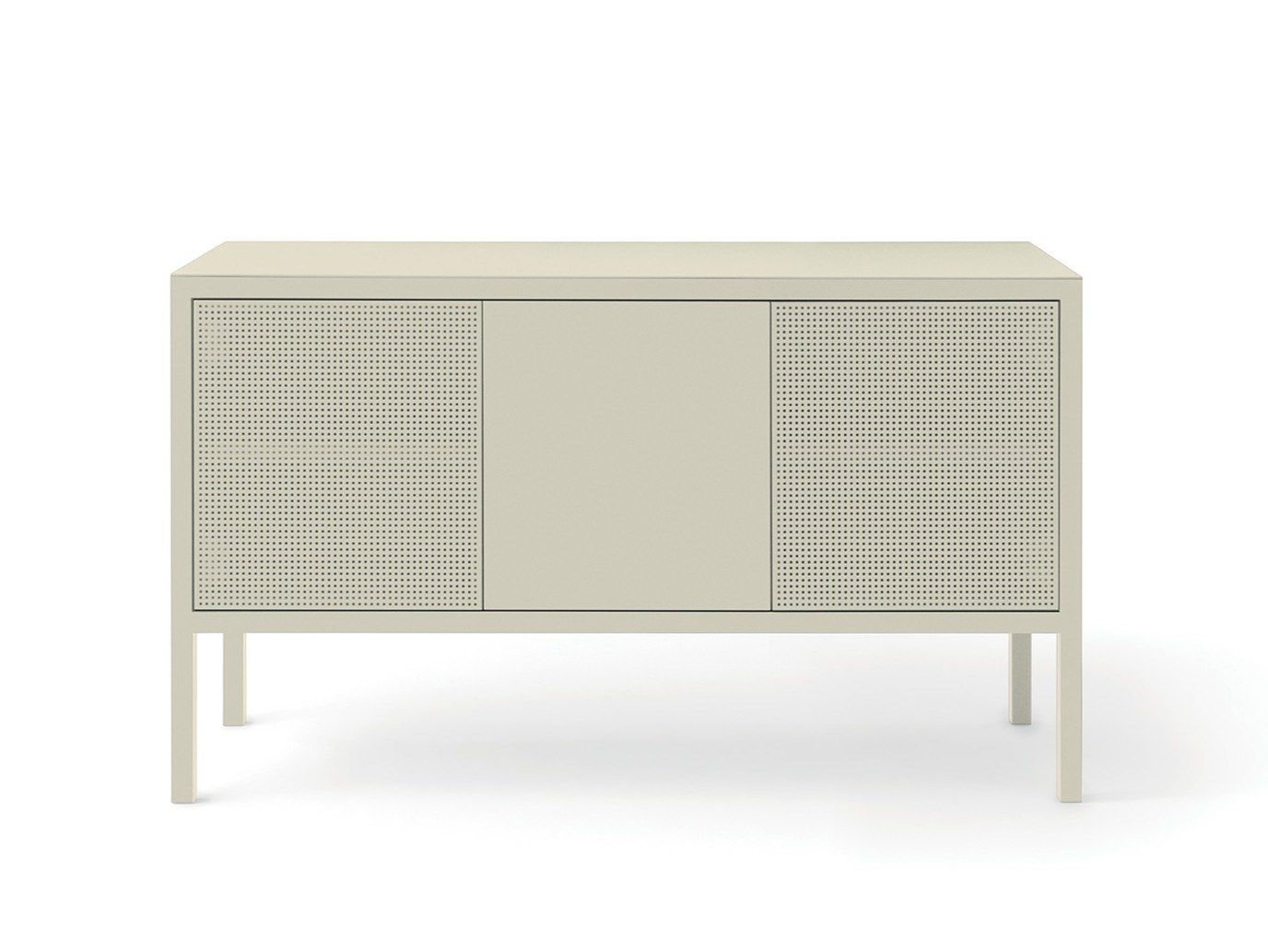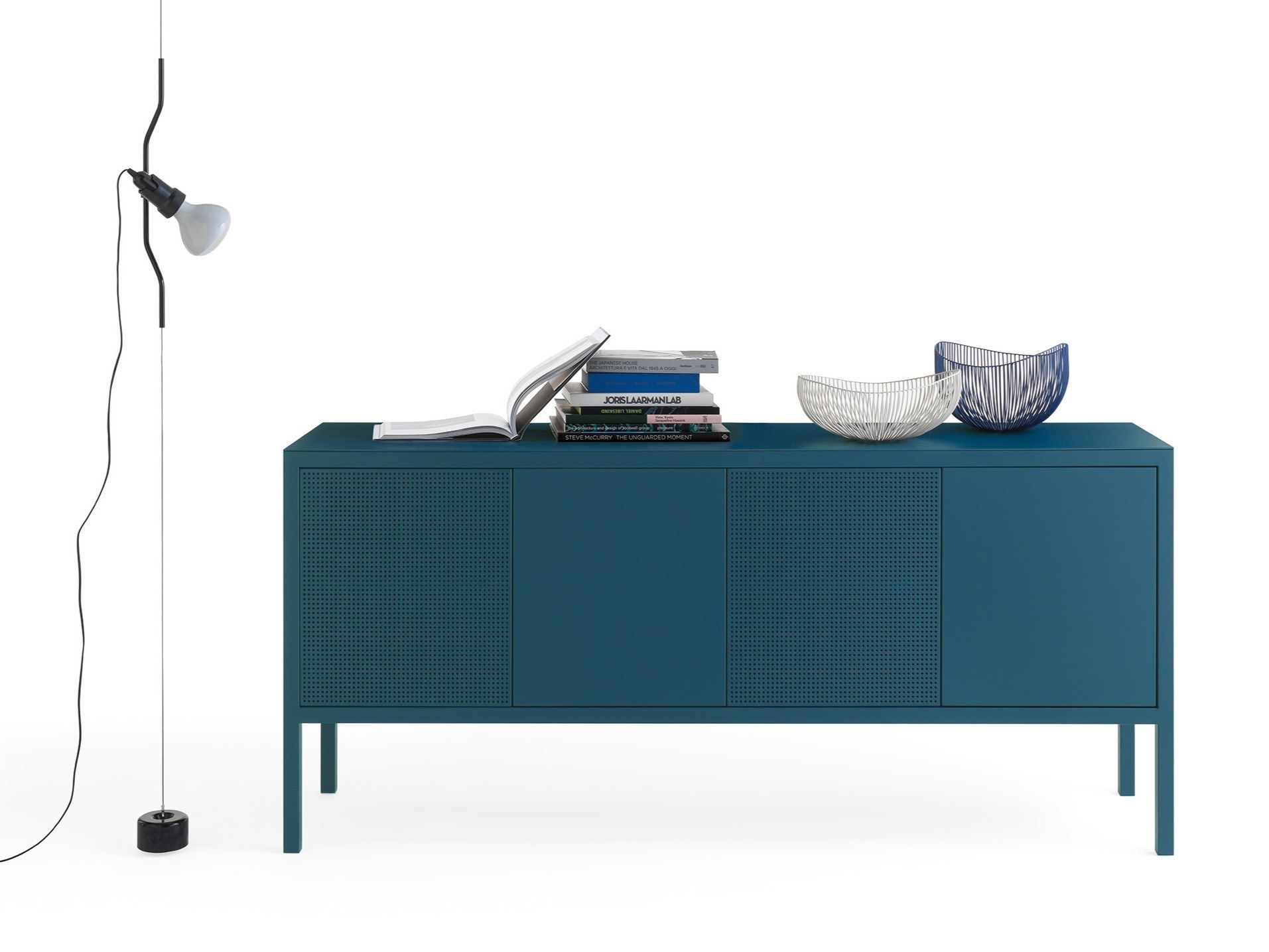 Frame is a painted metal sideboard available in various sizes and colors. The doors can be plain or perforated, with the option to alternate configurations.