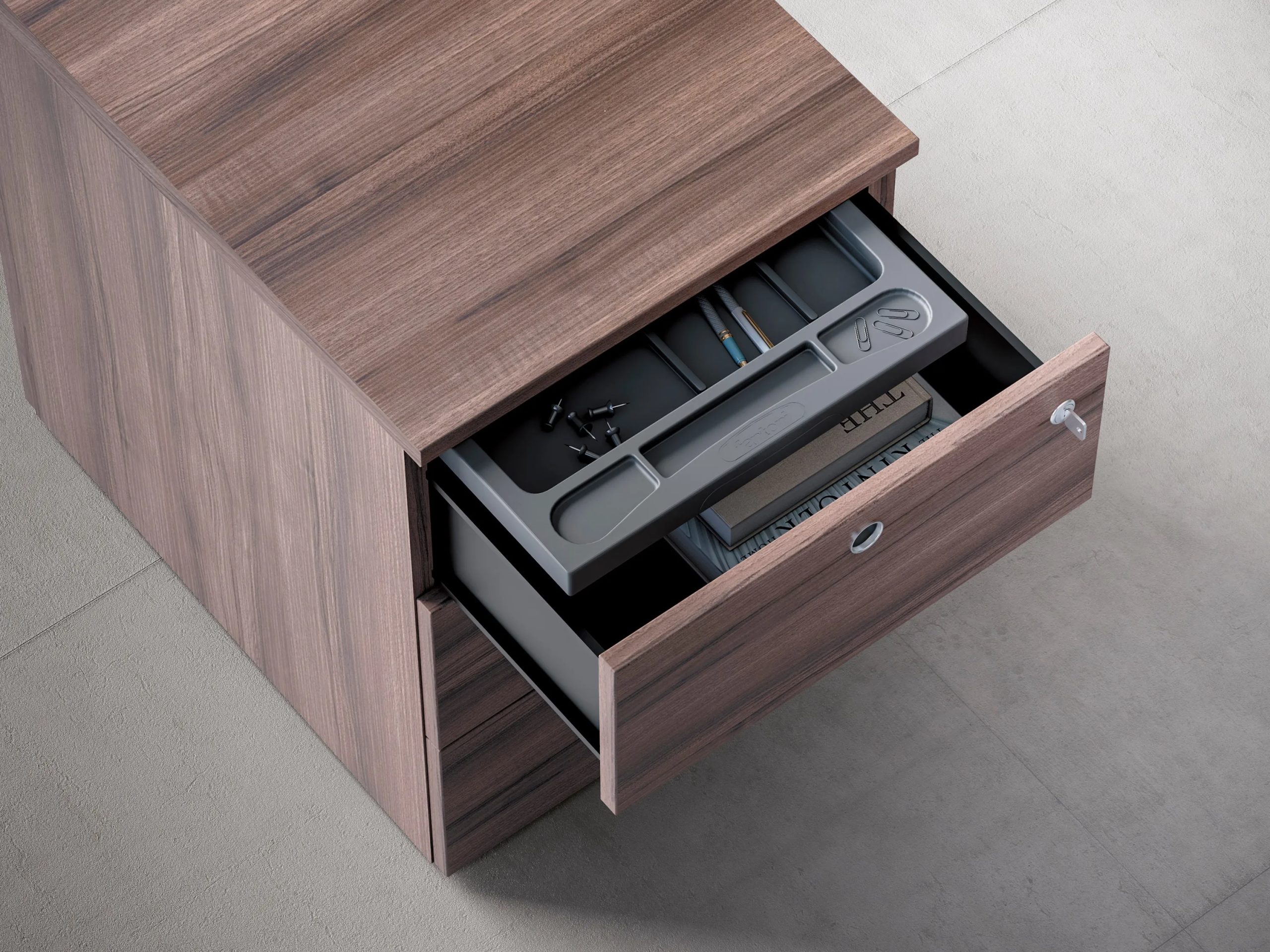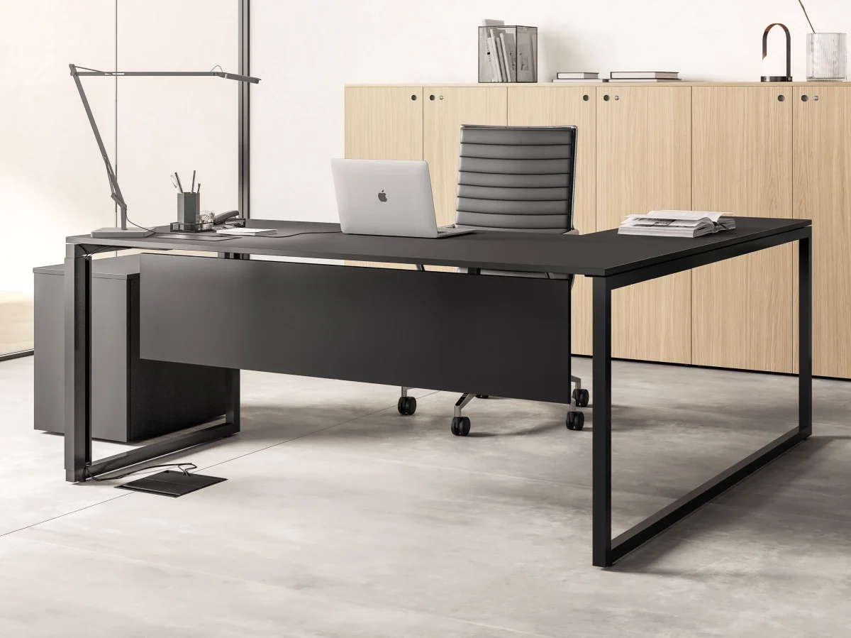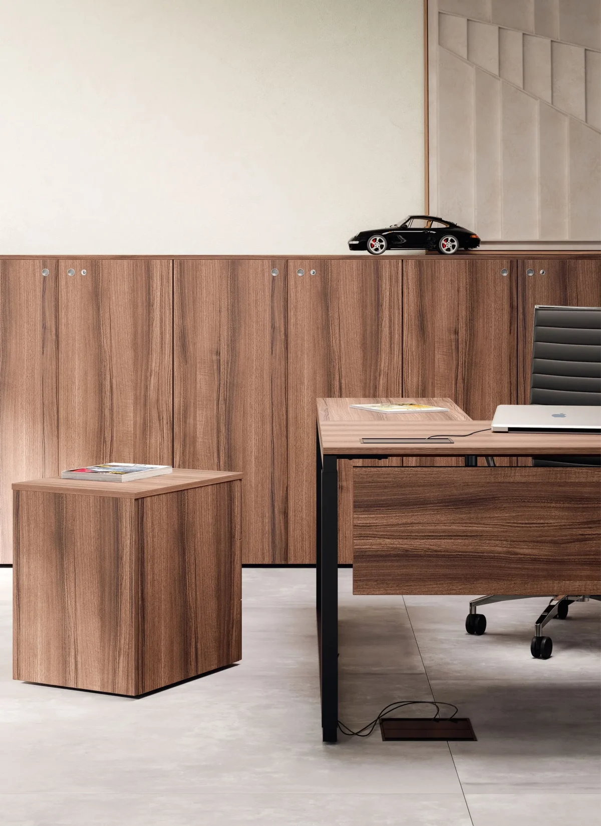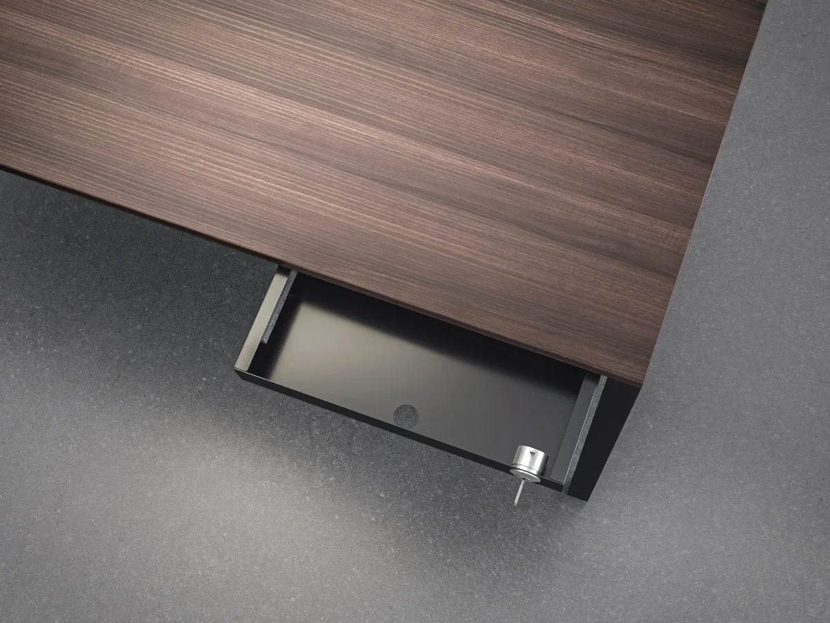 The deep shades of elegance. The peninsula desk with walnut finish and black legs as standard is another fascinating interpretation of the Framework 2.0 system. The distinctive colour gives the space an authoritative feel and makes the product suitable for executive use.