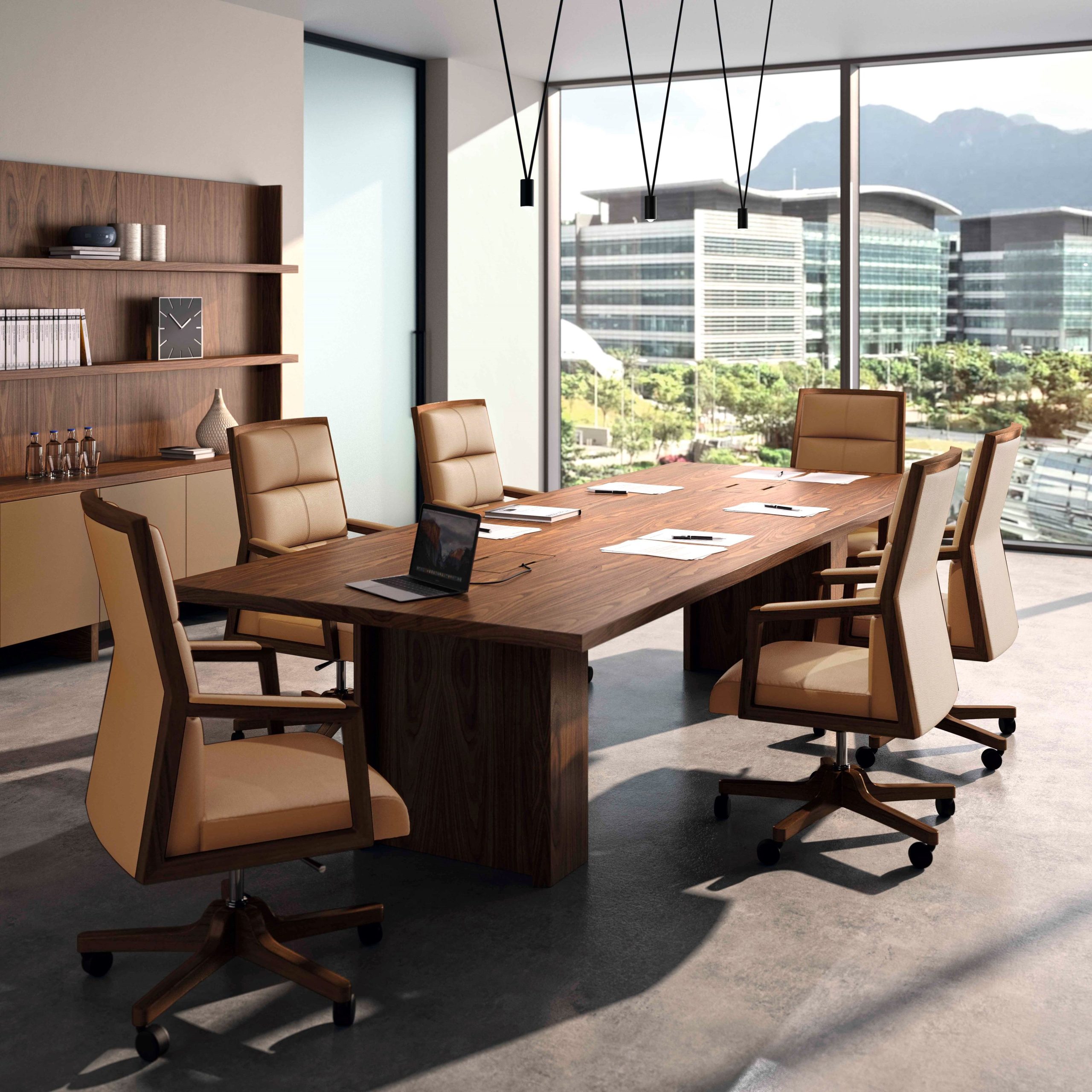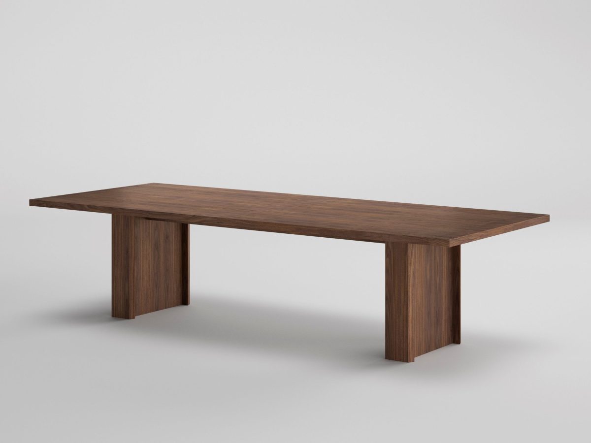 Freeport is a meeting table supplied with two wooden cable access in the top made by a wooden flip top with hinges. The table top is made of 40 mm 630 kg/m3 MDF fiber board thickness and natural American walnut veneer. With optional natural grain leather insert and 2 mm American walnut edge.