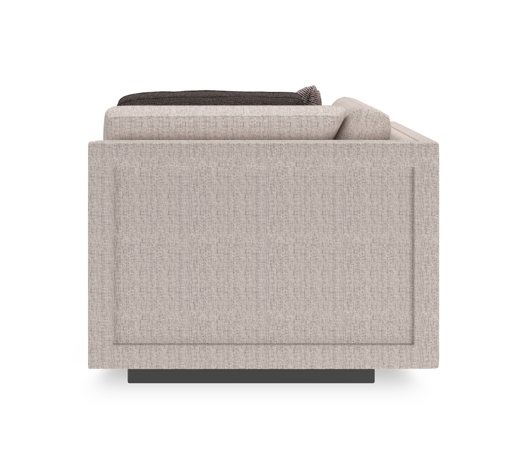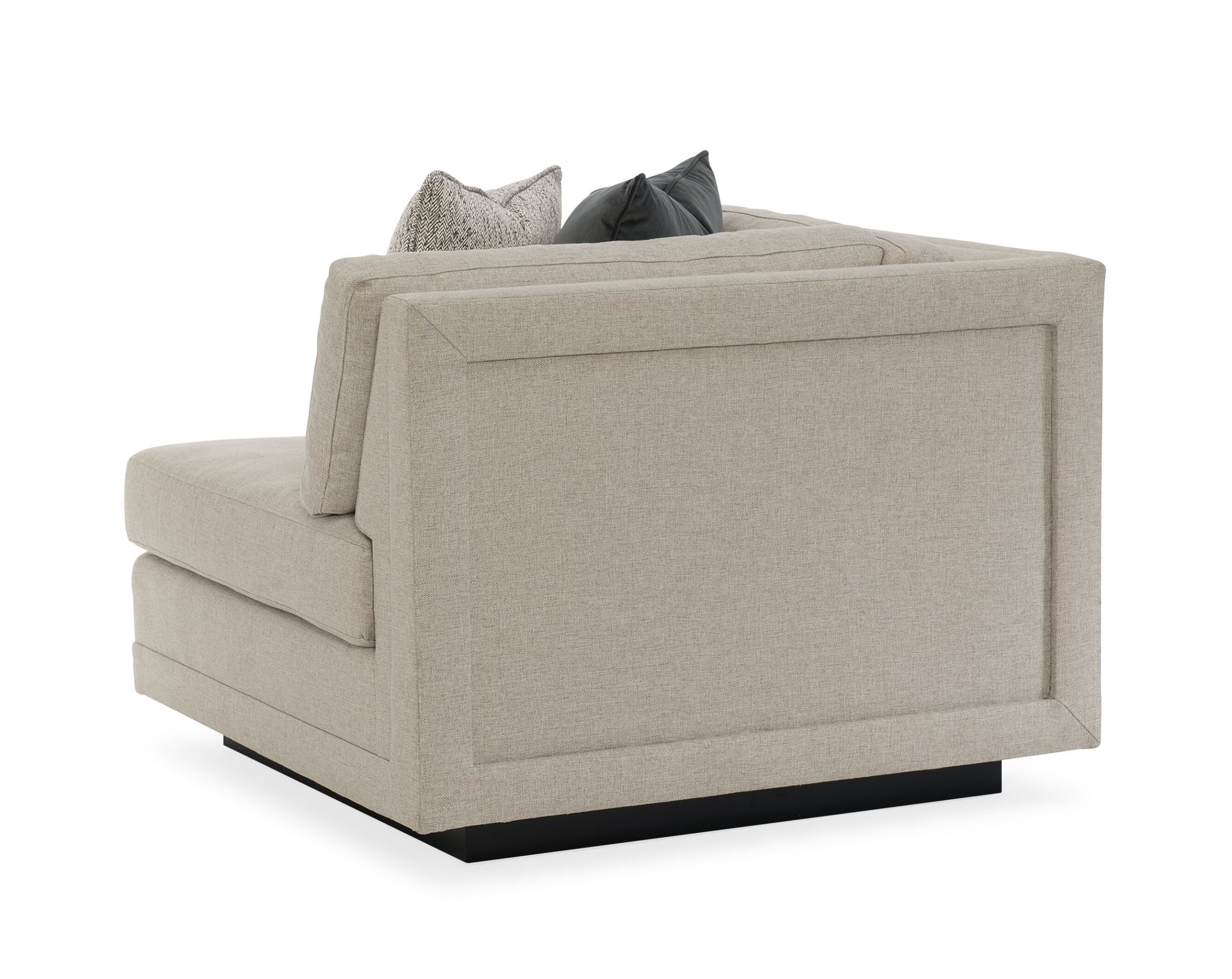 Designed to work with the Fusion armless chair, this touchably soft corner unit pulls the whole sectional together to create any sofa configuration you can imagine. Its modern tailoring uses an Oatmeal woven slub on the seat and back pillow that feature Blendown so you sink into their softness. The down accent pillow is covered with a chunky ivory/black/brown tweed. A cut-out boxing design around the outside back and a recessed wood plinth base in Simply Black are the finishing touches.