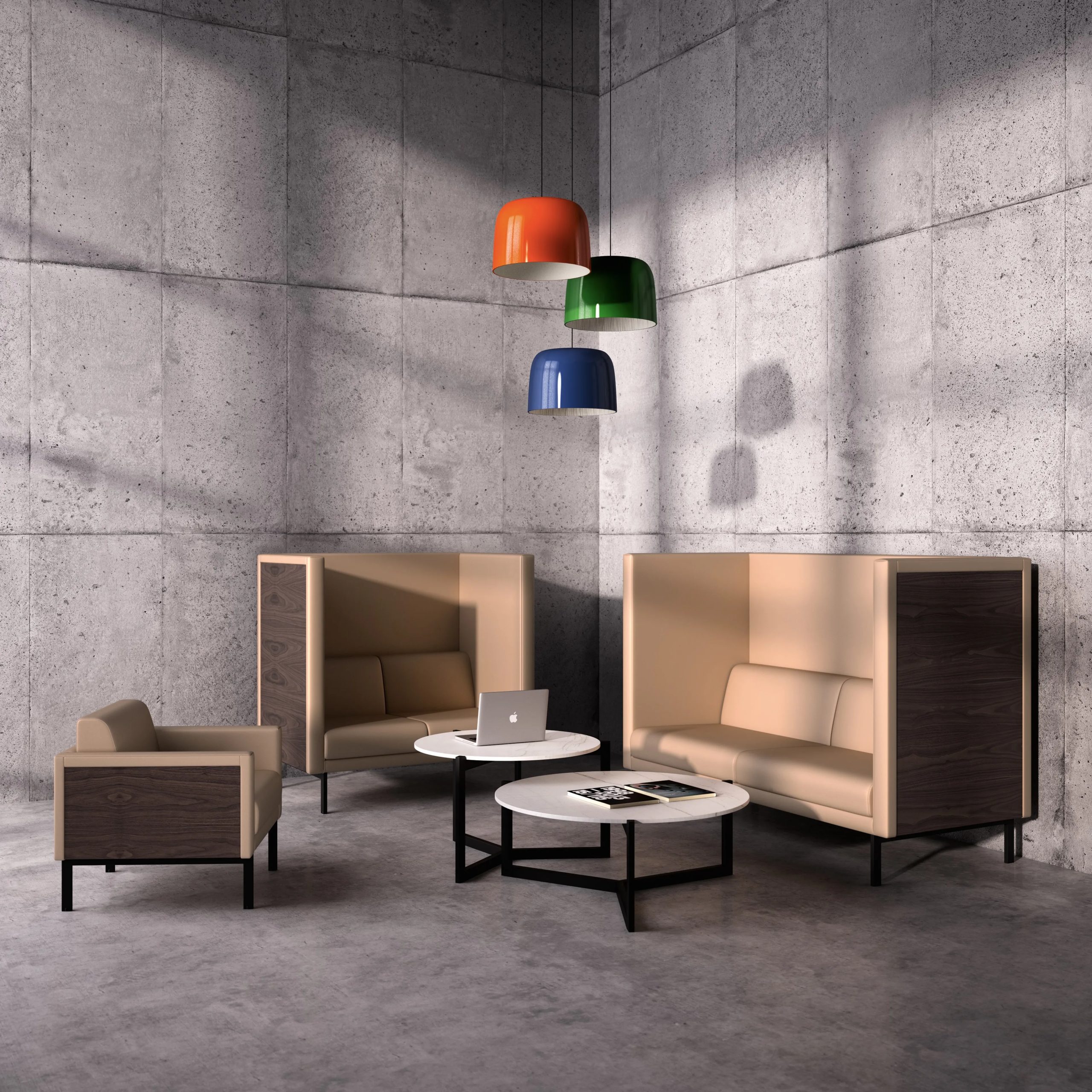 Gallery is a sofa made of mechanized wood, glued and upholstered in different finishes, accompanied by a decoration made of 20 mm thick chipboard in 0.5 mm thick natural American walnut veneer. Structure of the sofa made of steel tube with a rectangular section of 40 x 20 mm and thickness of 2 mm with metal assembly. Set of feet provided with levelers to adjust the height 10mm. Interior of the sofa made with molded 30D-25S density polyurethane foam. The sofa is available with 3-seaters or high-back version.
