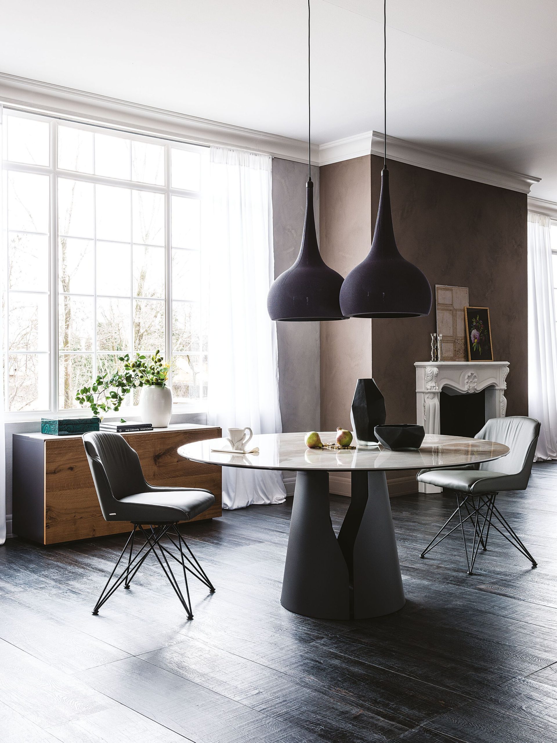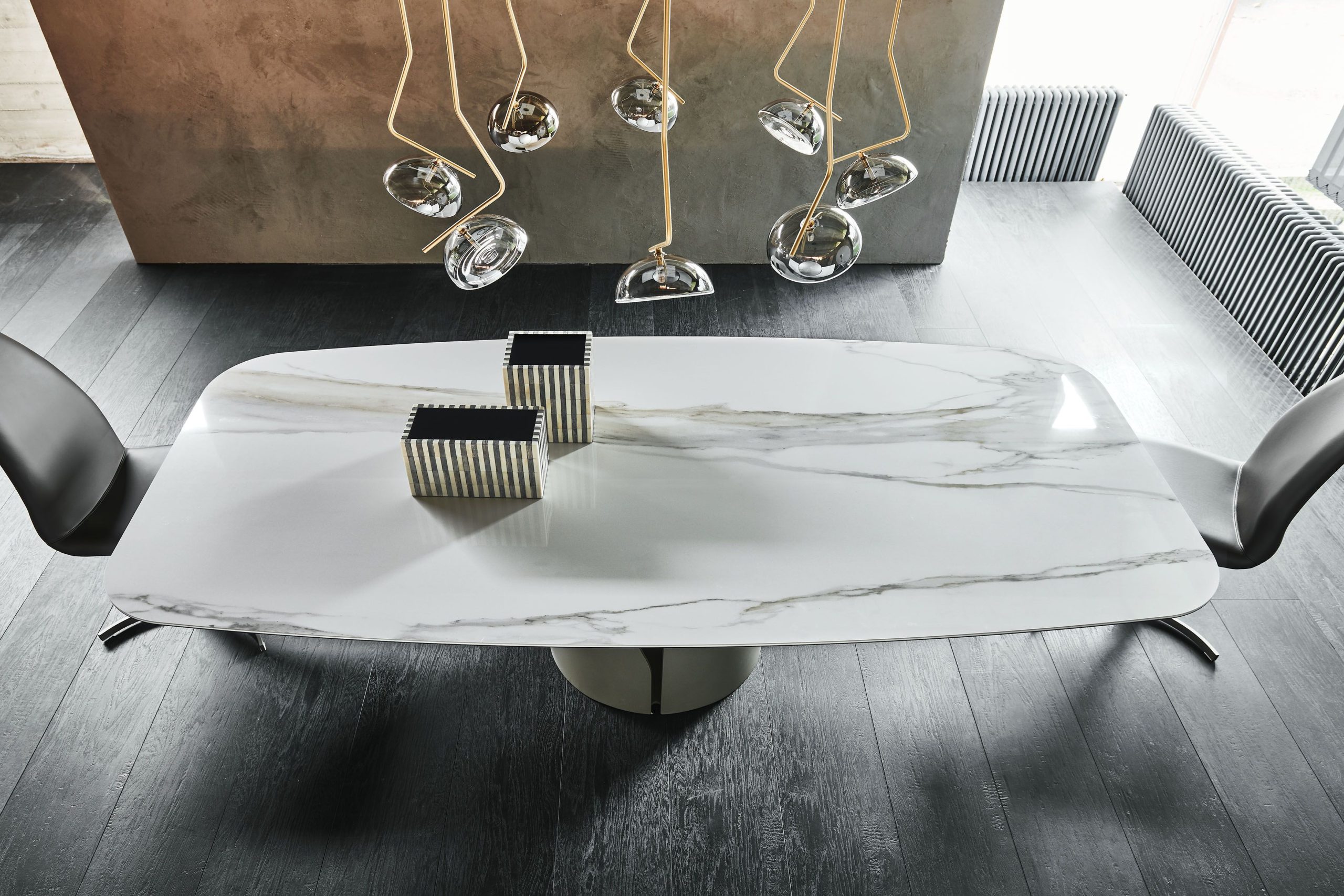 The modern tables in the Giano family give the dining room a contemporary and minimalist style. A sober stylistic imprint with a whimsical touch makes this design table a timeless piece of furniture. The round steel base has a precise slot that allows you to glimpse inside.