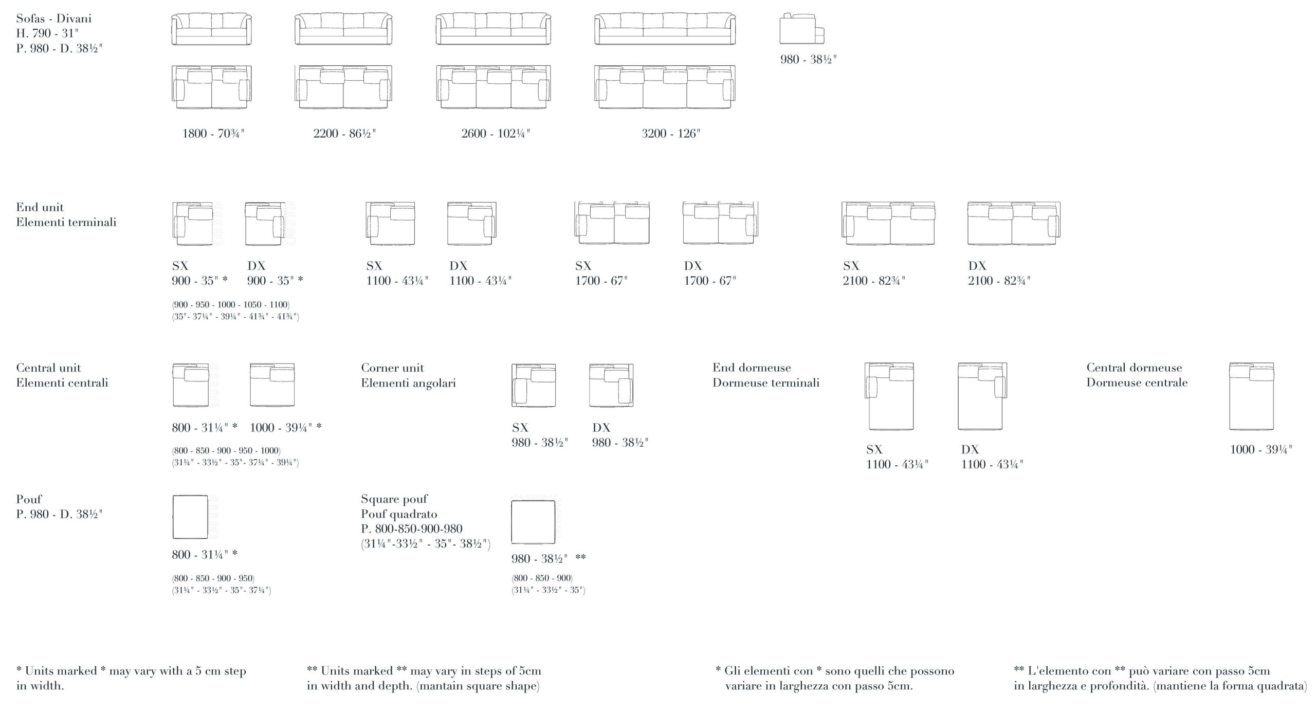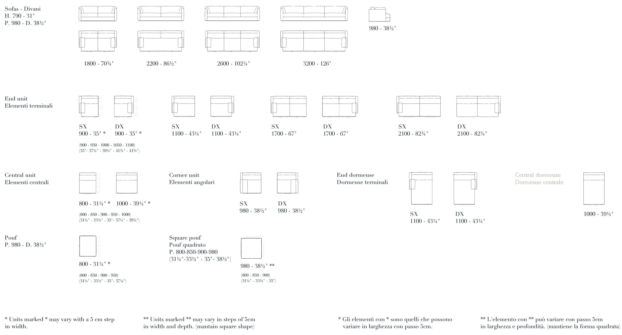 It is possible to choose the width of the central body, of the two terminals and of the pouf with a 5 cm step between the maximum and the minimum size of these sofa’s elements, in order to fully adapt them to different functional and aesthetic needs. The attention to details, sartorial elements and personalisation, fil rouge of all Lema’s designs, is enhanced in the Armadio al Centimetro system as well as in Glee: the careful selection of materials allows different chromatic and material combinations, giving life to this new elegant “tailor-made” proposal, perfect symbol of Officinadesign Lema’s constant research.