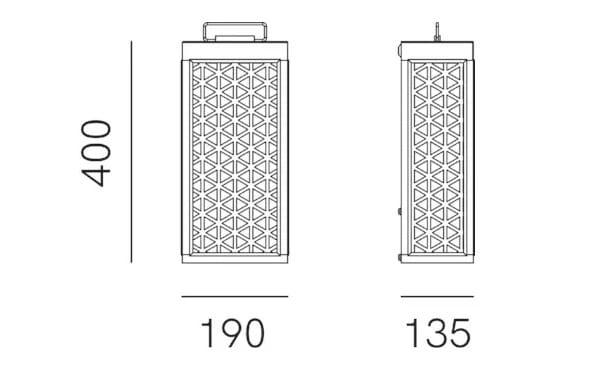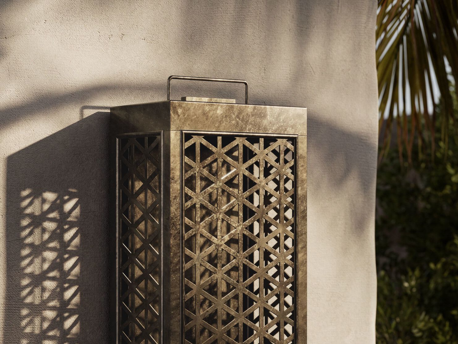 GRID, with its range of outdoor floor and wall lanterns, impresses with the decorative use of perforated sheet metal. The pattern used is a clear reference to the geometries of the Mediterranean world, which, thanks to the integrated LED, creates geometric plays of light and shadow.