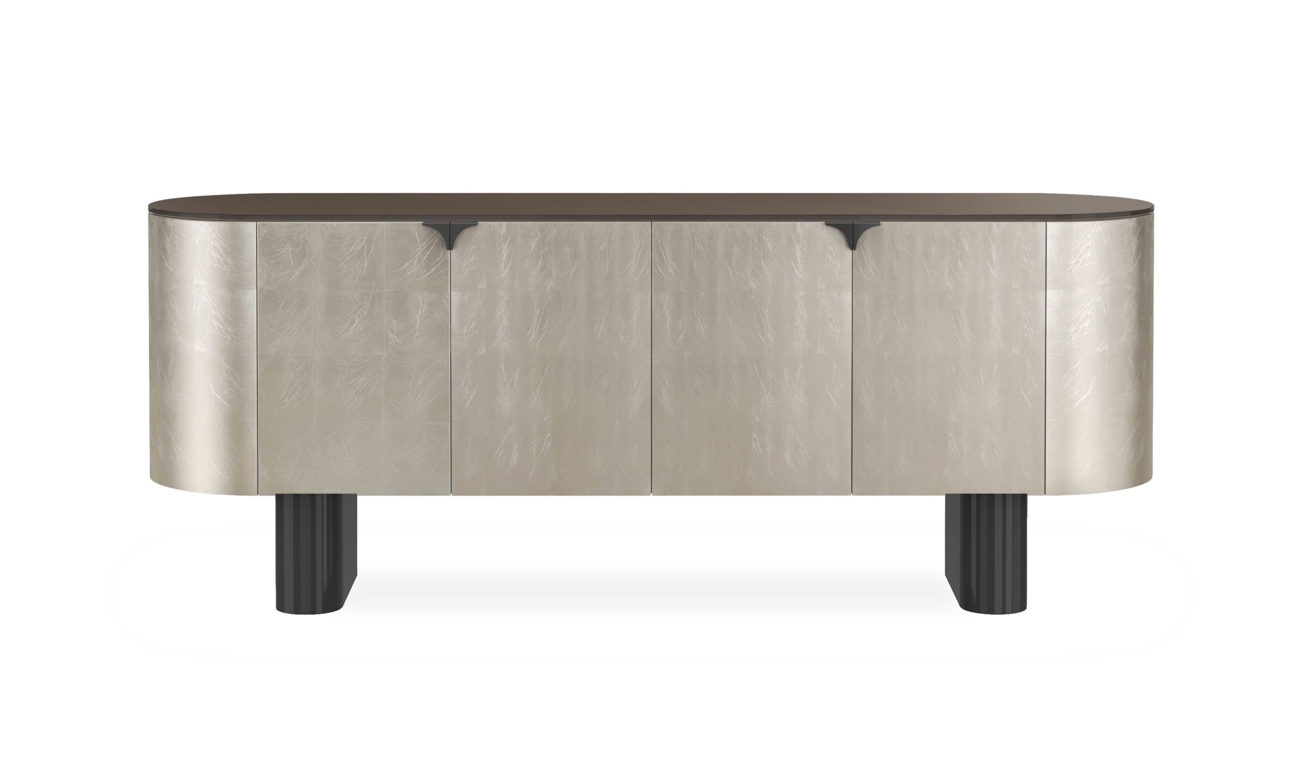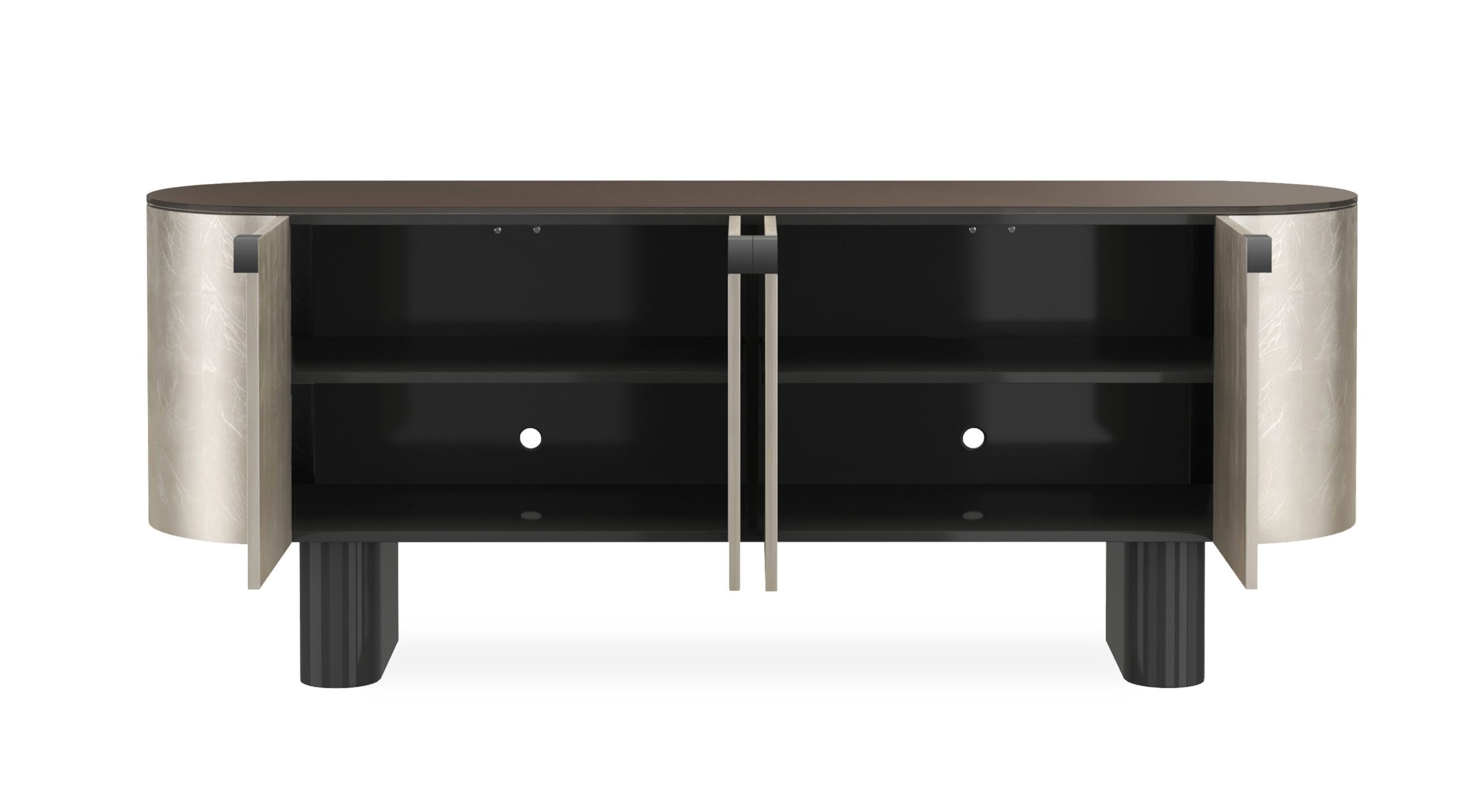Gustav is a slim media console with dramatic appeal. The elongated oval chest sits atop Deep Bronze elongated cylindrical legs. Finished in Charcoal Leaf, four doors with triangular Deep Bronze pulls open to an Almost Black interior with four adjustable shelves and wire management access. The piece’s top is Smoked Bronze glass.
