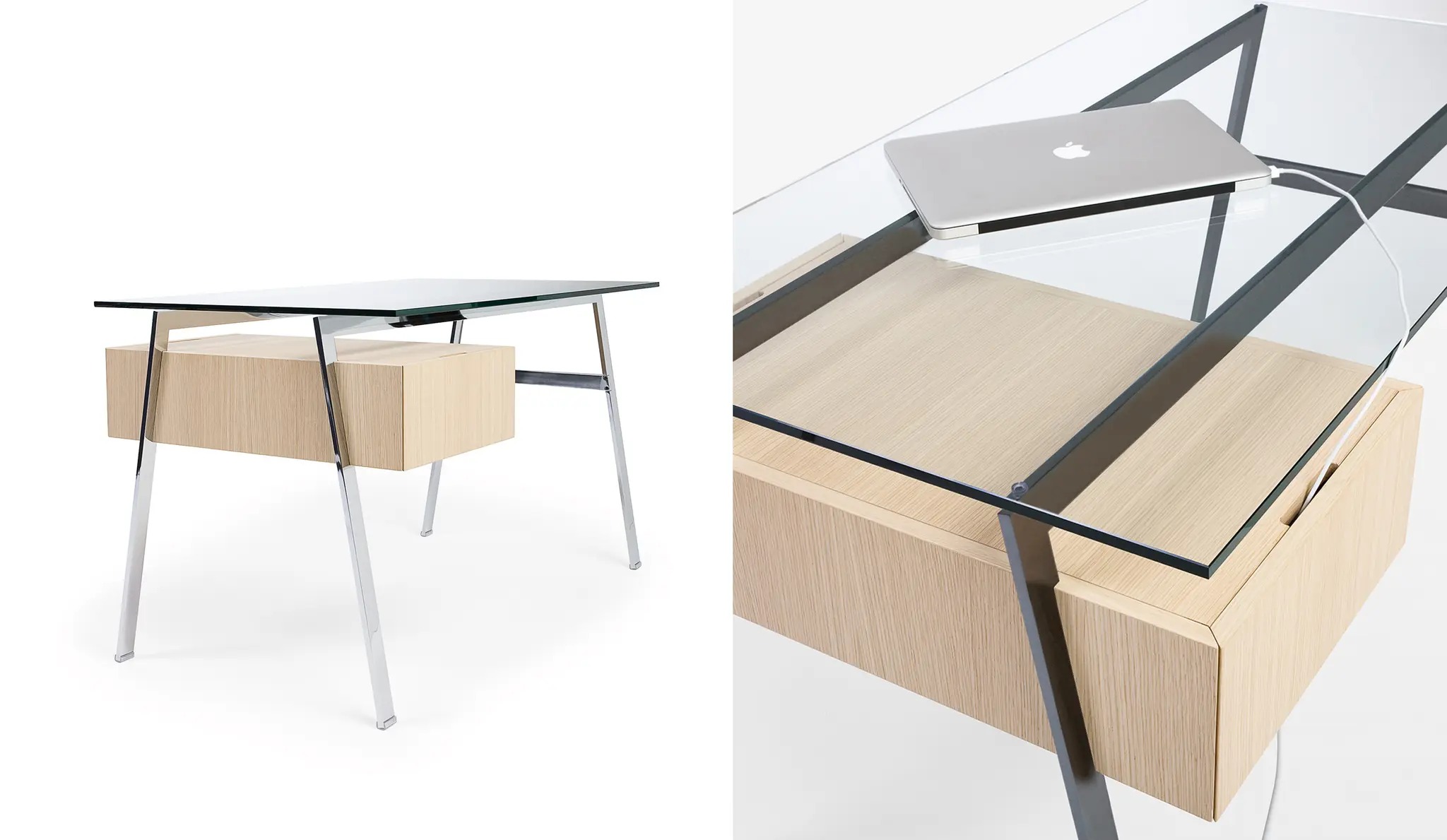 Highly versatile and customizable, the Homework is a deceivingly simple writing desk. Conceived for home offices or other small offices where the desk will be on display, Homework can be adjusted according to your unique needs. The Homework desk is an elegant and highly versatile writing desk. Using a unique construction method evolved from traditional trestle tables, notched cabinets cantilever from the frame appear to float yet result in an extremely sturdy desk