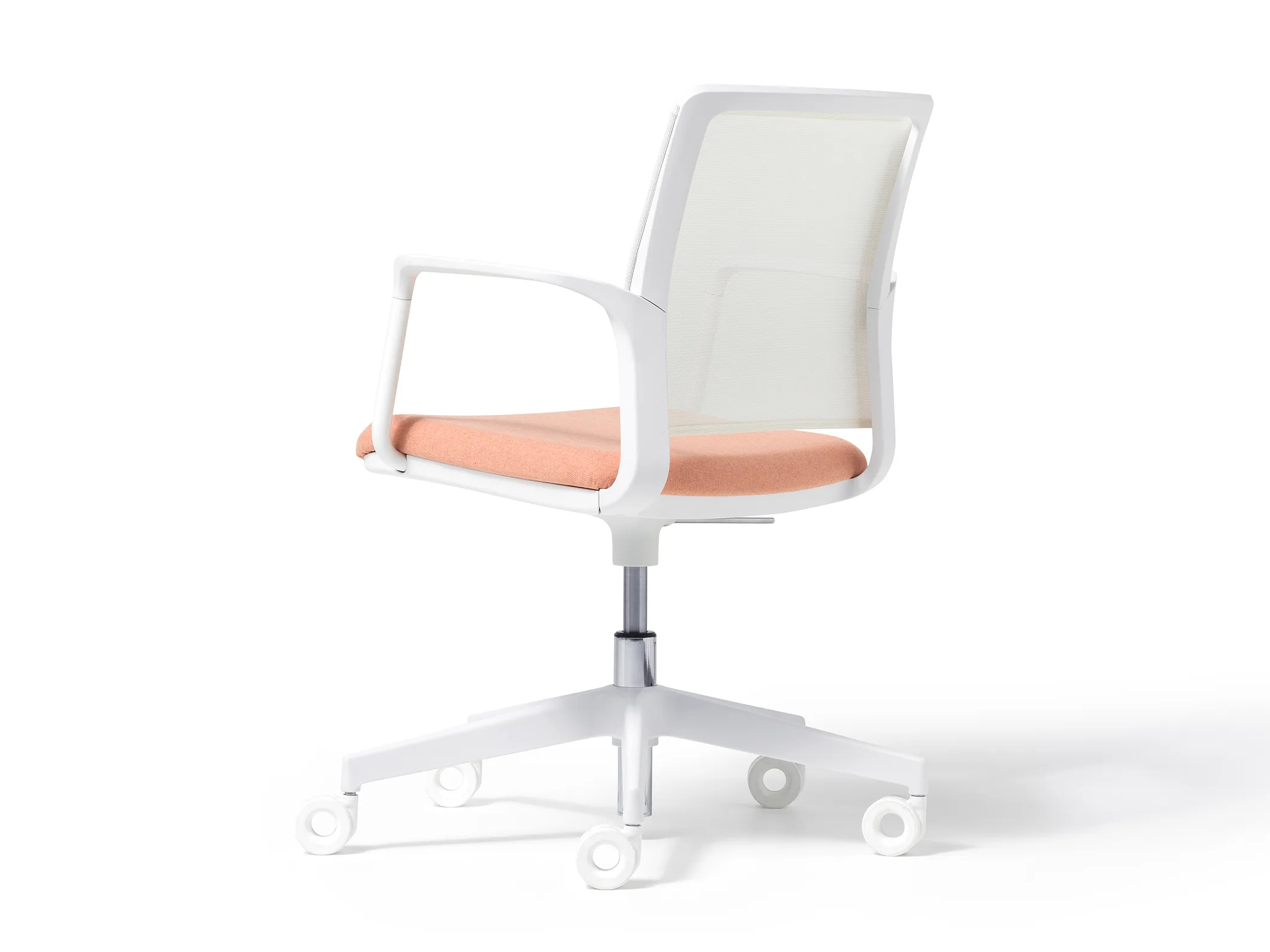 Visitor chairs with upholstered seat and mesh backrest, height-adjustable and swivelling on a 5-spoke base with castors from the HOST collection.