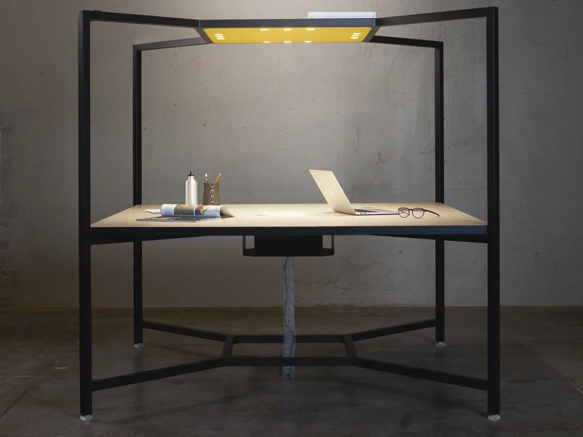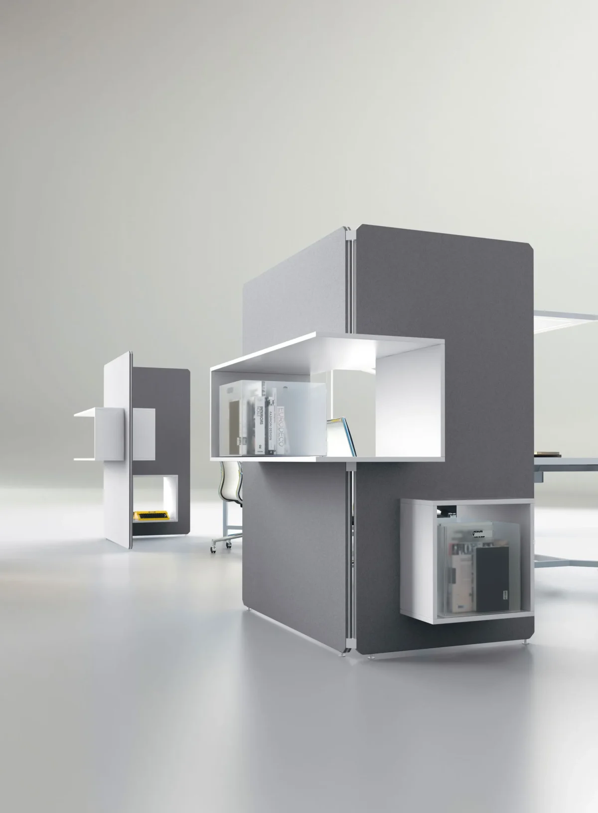 A relationship-oriented workstation that can be personalized and rearranged to meet individual needs, the direct descendant of the Abitacolo combi-bed that Bruno Munari first dreamt up to combine the different activities in the day of an adolescent, and to map out the time for each one: rest/play/study/ relationships.