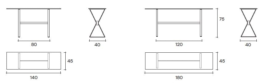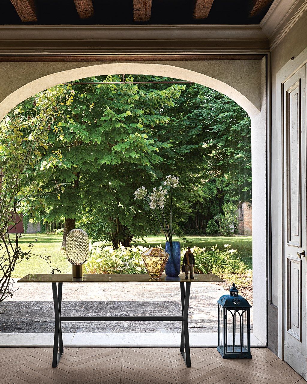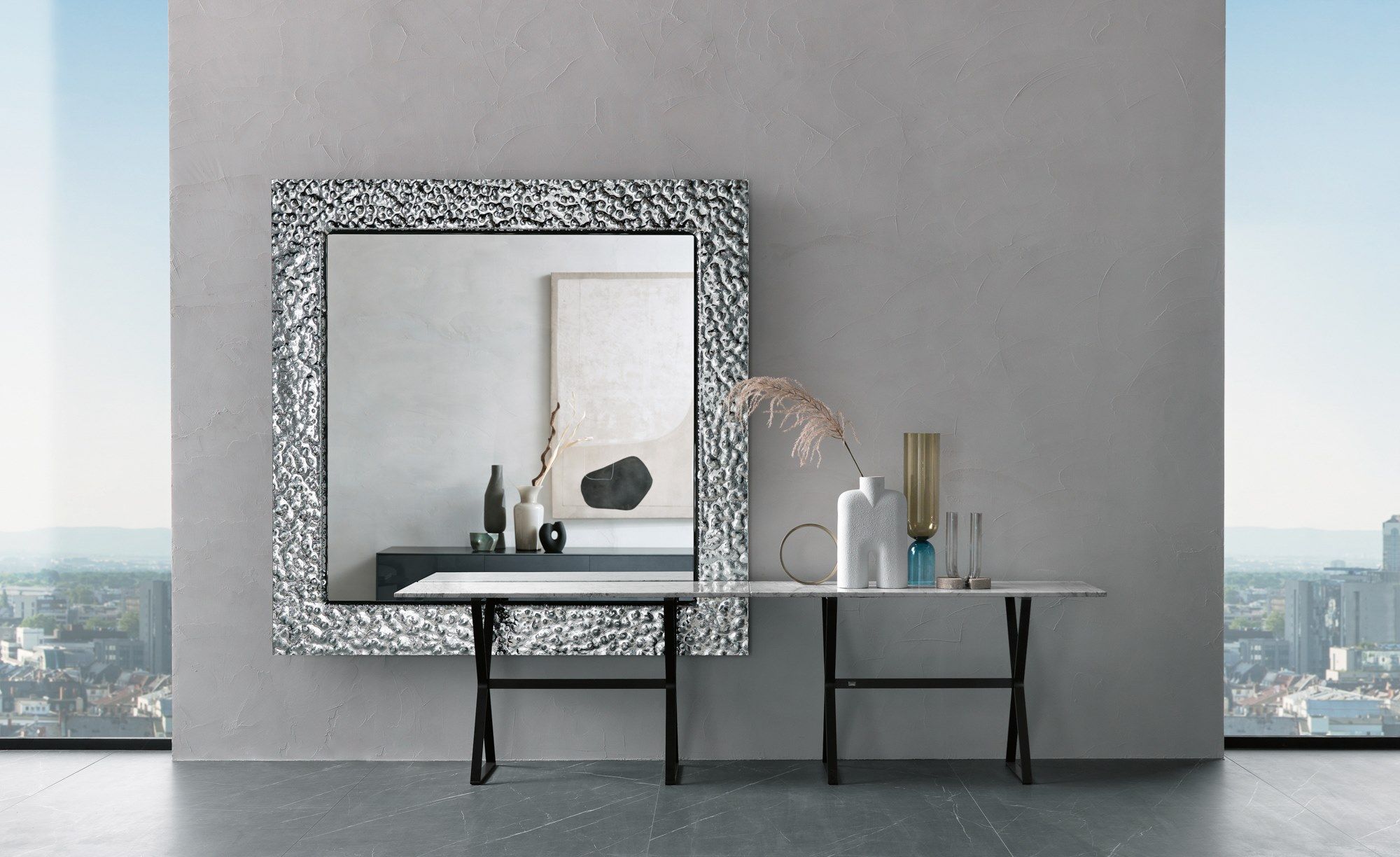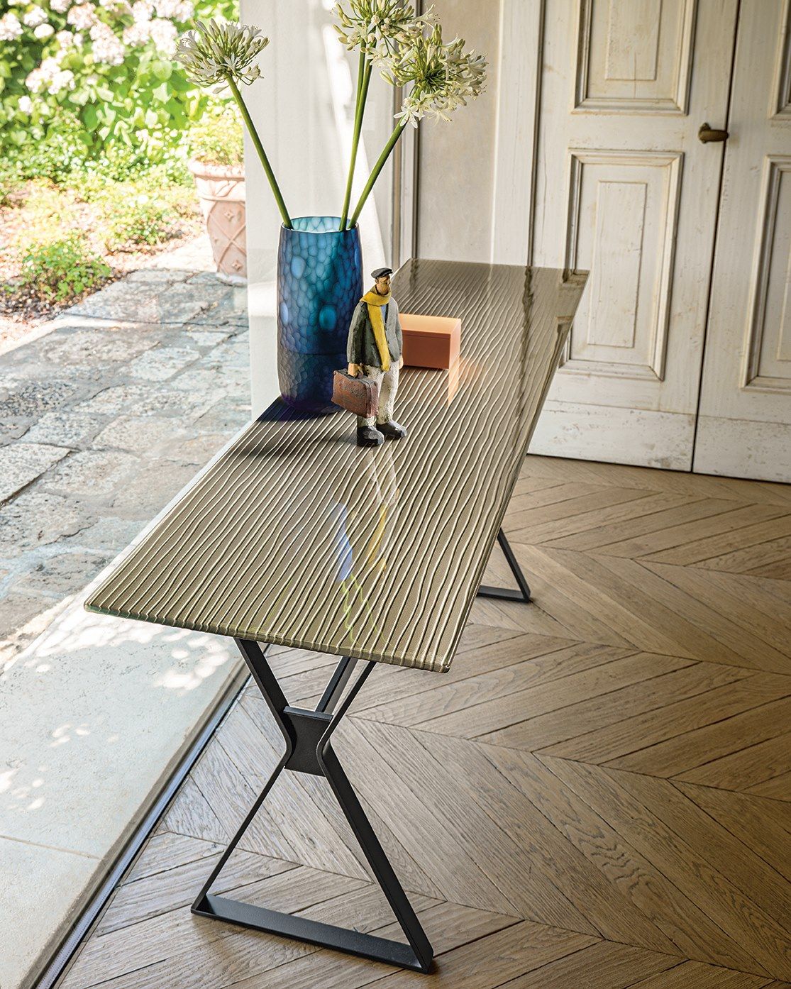 Hype is a console with 12 mm fused, tempered and back-lacquered glass top with metallic paints. Top available also in marble. Painted metal base, Lava Grey finish.