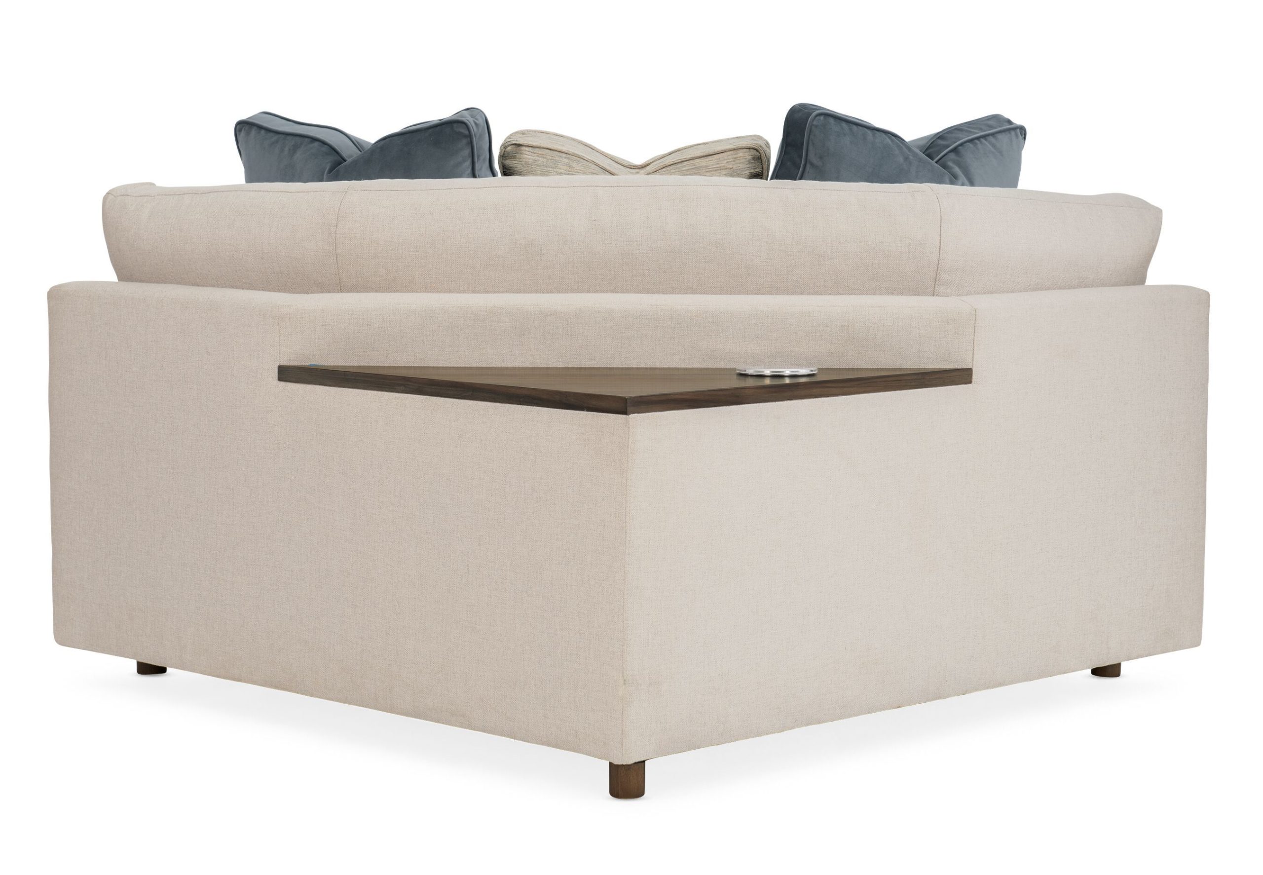 I’m Shelf-Ish is a thoughtfully designed center wedge that features a wood shelf finished in Smoked Sable and provides a place for snacks and beverages while concealing a pop-up with multinational AC and USB charging plugs. Destined to be a favorite spot for resting and relaxing, this piece is upholstered in a neutral, linen-like fabric with a small, modern herringbone pattern. Accent pillows in shades of slate and goldenrod add impact and style.