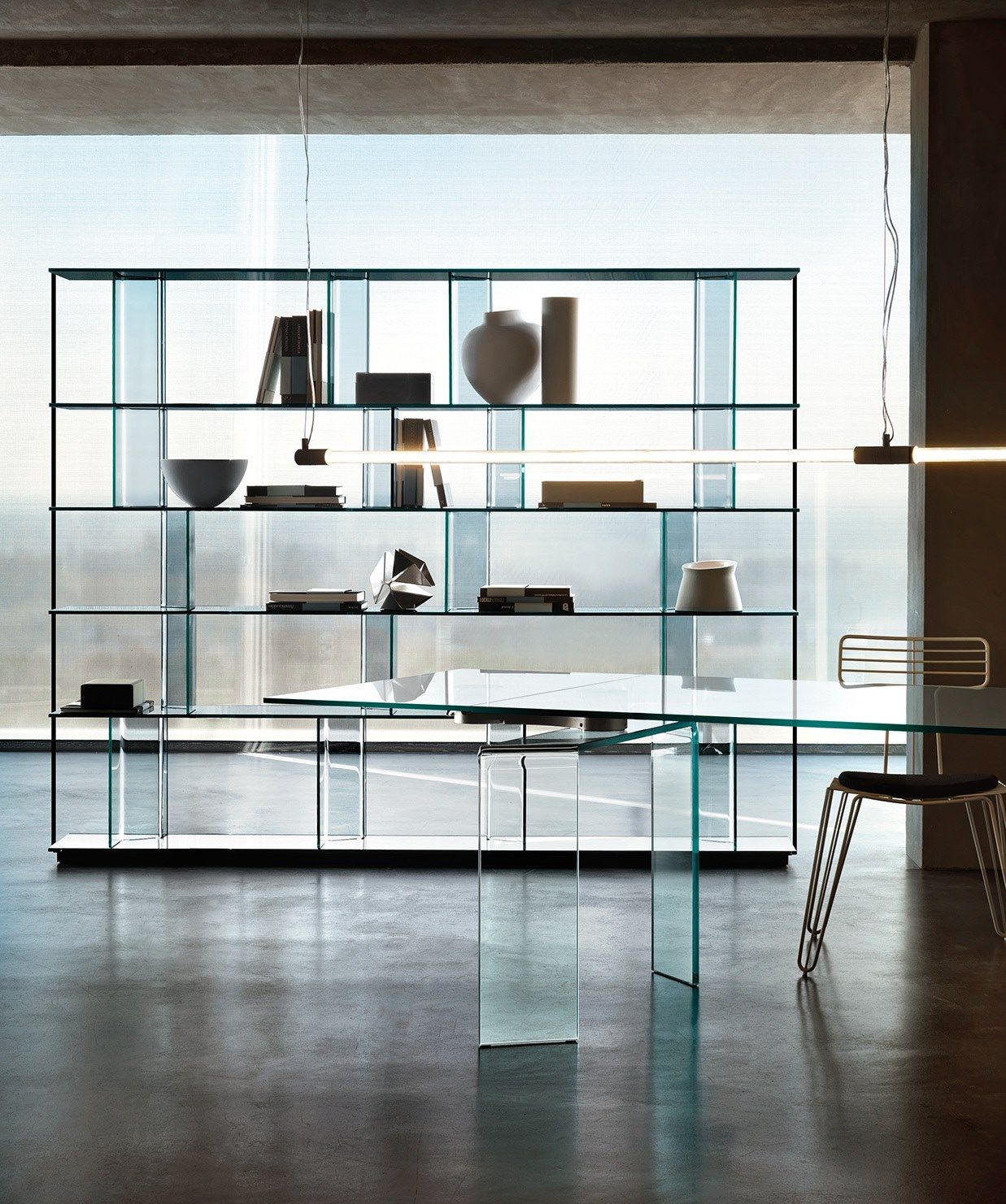 Inori is a modular book shelves glass or wood system. The versatility and assembly possibilities allow the utilization as a show-case, display-case, TV-unit. Available the free-standing version and wall unit. The uprights are freely adjustable on each shelf through sliding rails and fixing device. Slides in anodized black aluminum.