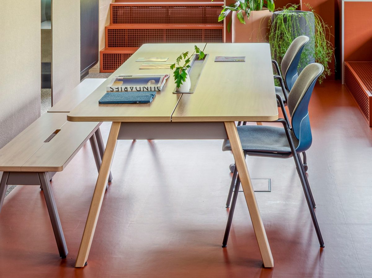 Intuity Park Bench: A shared work table. Visual markers of informality and open space. Intuity Park Bench embodies an informal aesthetic, inviting you to “stop by, sit down together, and take an open-minded moment to reflect and share ideas/experiences.” With soft timber lines and fresh color accents, Intuity Park Bench fosters a sense of community and sharing. It’s perfect for creating collaborative settings where individuals and teams can huddle, incubate ideas, and socialize. Embracing the ethos of multi-use and sharing, Intuity Park Bench features a unique range of playful work-tools that can be placed in its central tray, catering to various activities. Designed for spontaneous collaboration and quick touch-downs, Intuity Park Bench ensures you always have a place for your belongings. It includes special features like hooks for handbags (supporting up to 5kg) and a footrest which can act as a platform for heavier luggage.