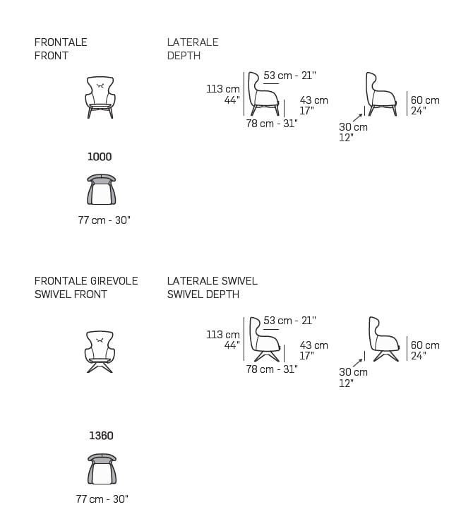 -Version Cod.1360 with swivel beech wooden base painted in standard colours: Natural (Cod.01), Walnut (Cod.02), Wengé (Cod.05).