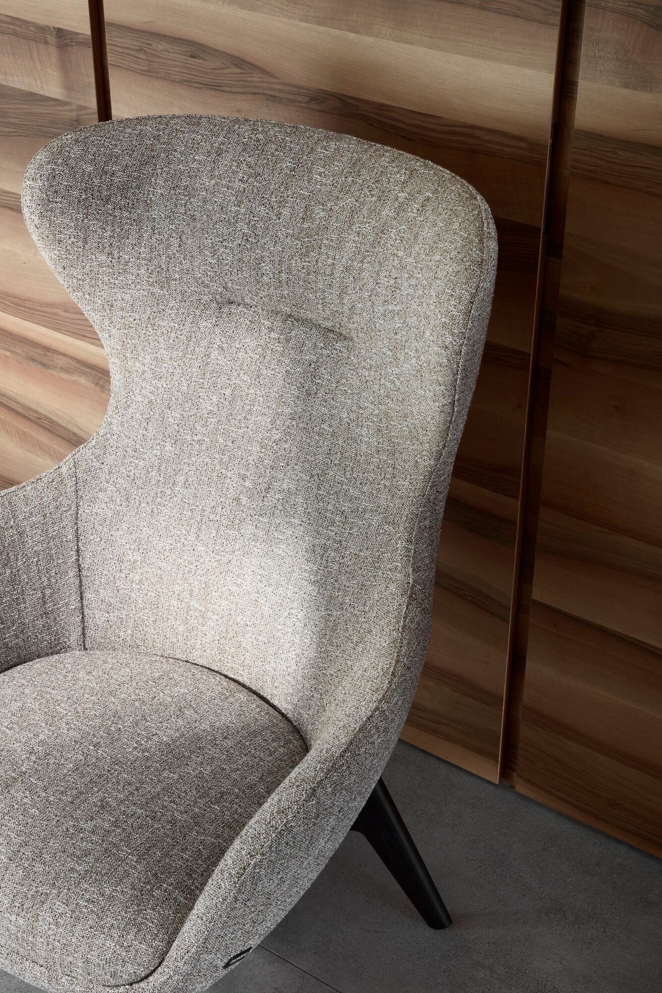 Iseo reinterprets the classic Bergére armchairs in a contemporary way through a new aesthetic. The slender Wenge wooden base guarantees an ideal seat height for optimal comfort. The stitching on the back serves as a design element but also amplifies its comfort. Available in fabric, leather or mix version.