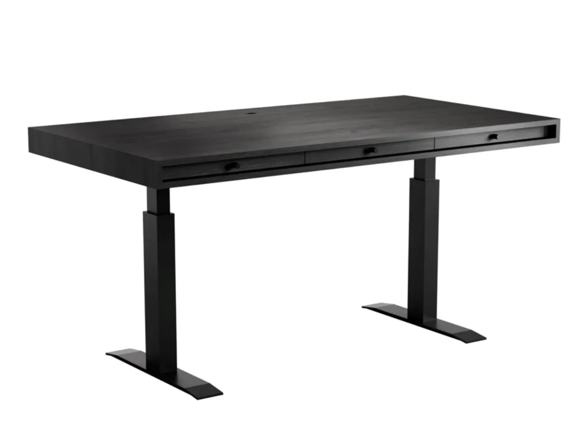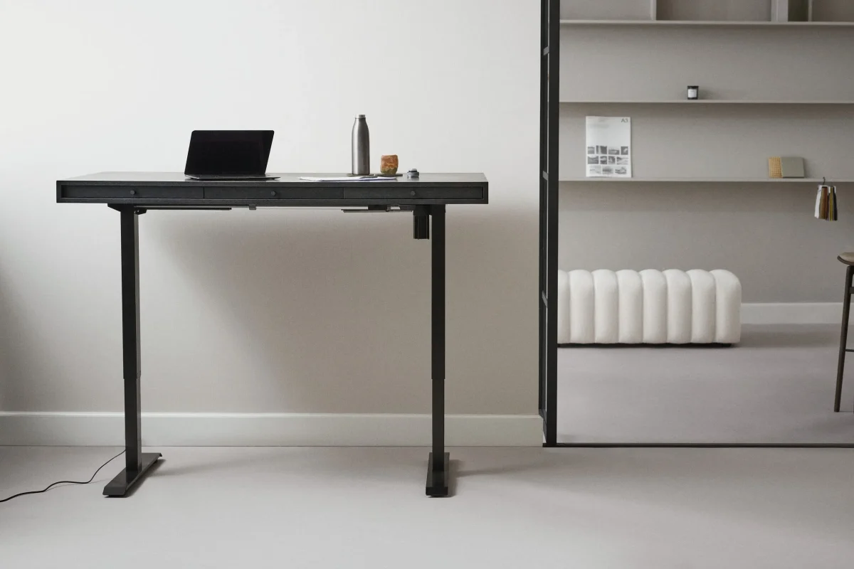 With its pure and simplistic design, the 60s inspired JFK Desk is designed for the stylish home office. The name is a tribute to a classic Danish design given as a present to president John F. Kennedy during the 1960s. The desk has a slim tabletop of ash veneer with three inbuilt drawers and stands elegantly positioned on top of four conic shaped black powder-coated aluminium legs. Each drawer has a small knob with knurled texture, as a reference to old Jaguar radio buttons. The tabletop has a hidden space for a power bank, making it easy to power a laptop, table lamp or smartphone. The cable from the power distributor can be wired through a small hole in the legs, creating an elegant desk without messy cables on the floor. The JFK desk now comes in 2 different sizes and with a smooth and comfortable height adjustment experience so users both short and tall can find their ideal desk height whether sitting or standing.