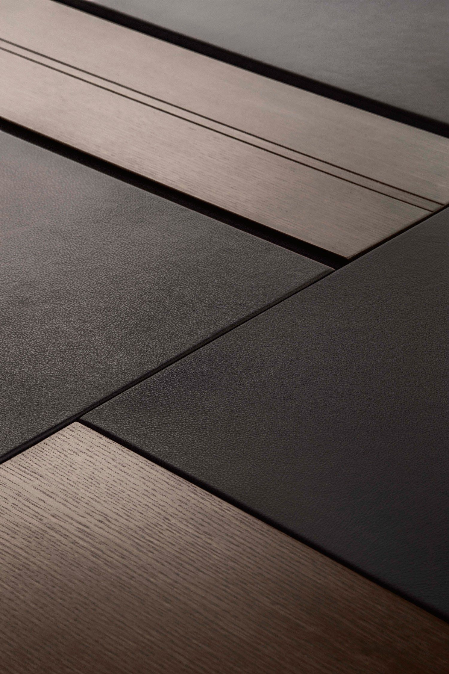 The surface is produced from MDF upholstered in Pelle Frau leather from the Color System. The cable tidy door is available with Rovere Piombo or Rovere Tabacco veneer with mat finish or upholstered in Pelle Frau leather from the Color System.
