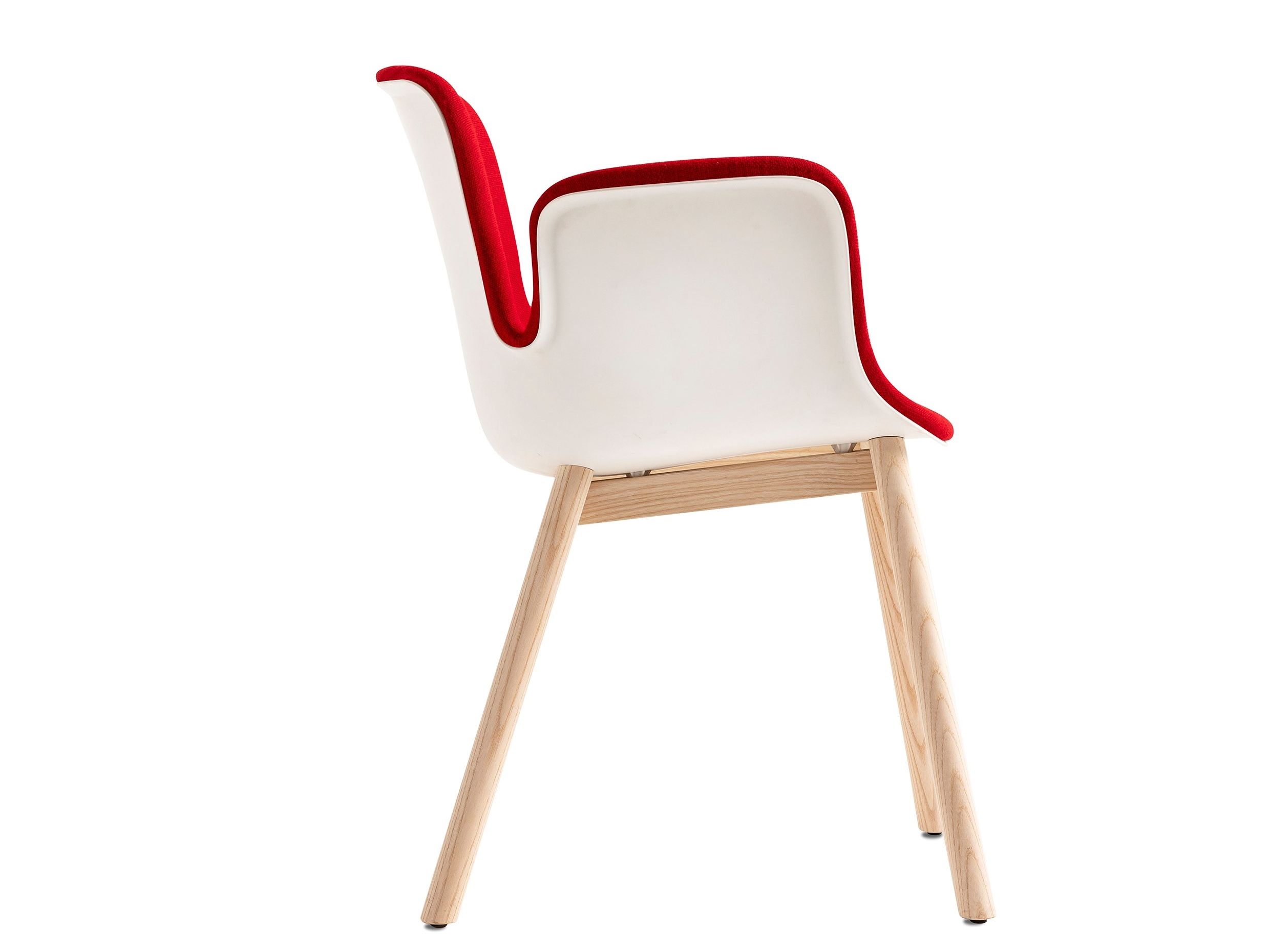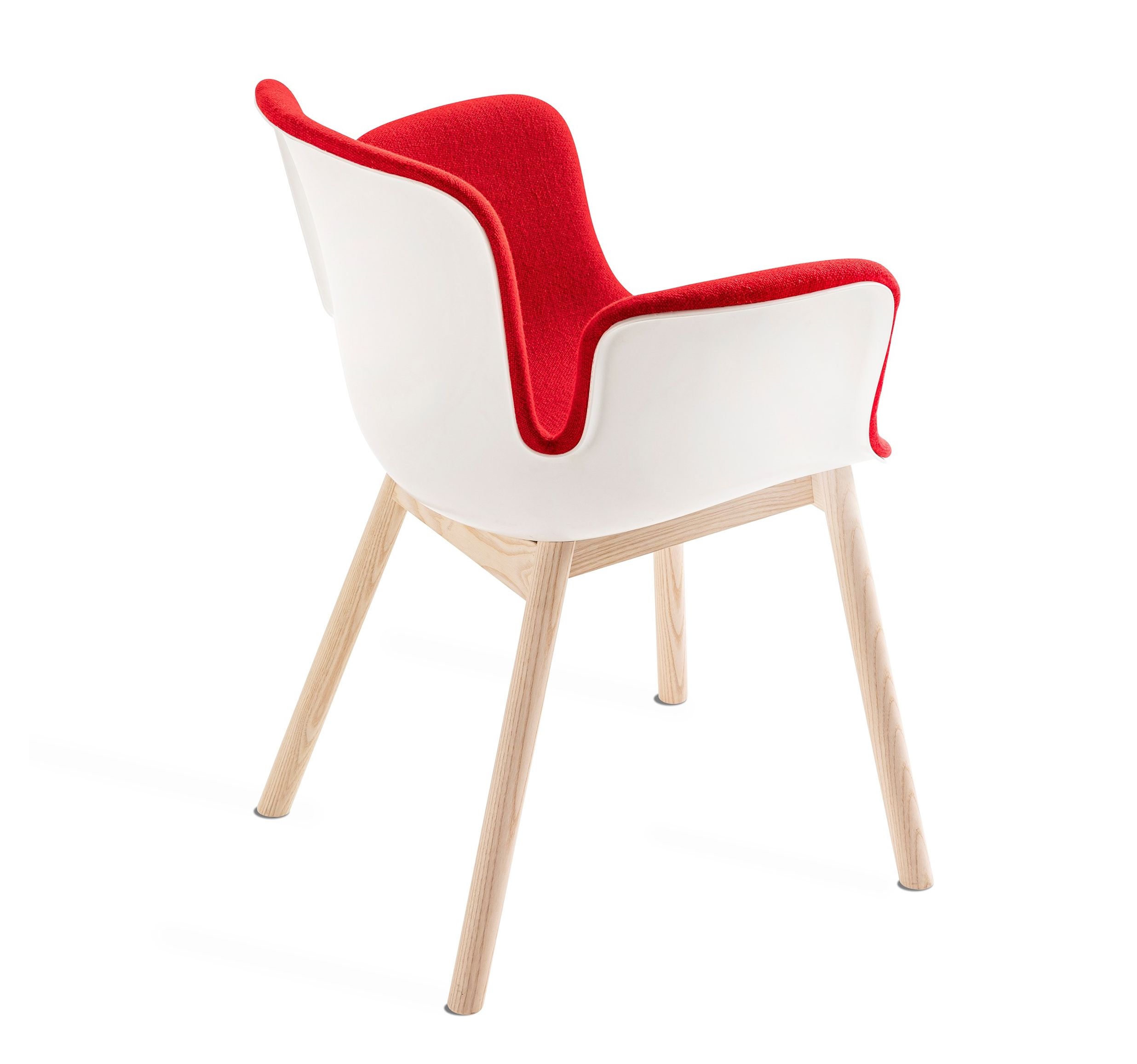 In the Juli Comfort armchair, the recycled plastic shell is made using an injected technique, for extreme durability; the seat, in polyurethane and foam, can be upholstered in a selection of fabrics, leather and eco leather.