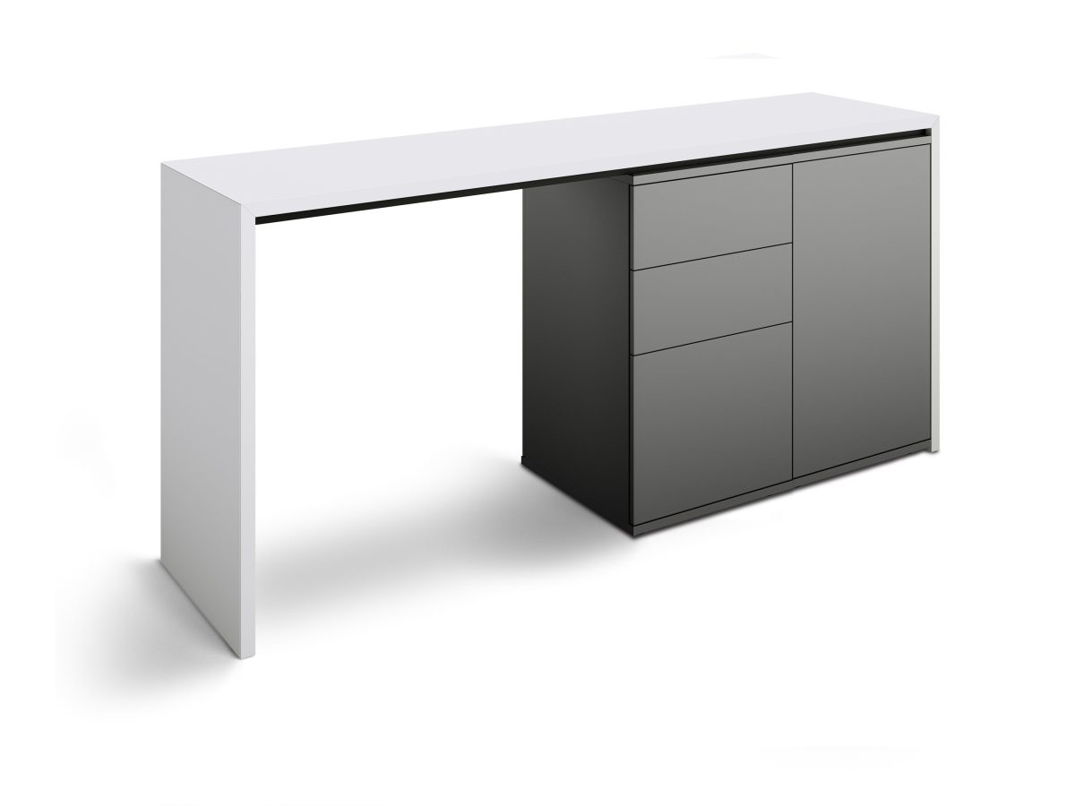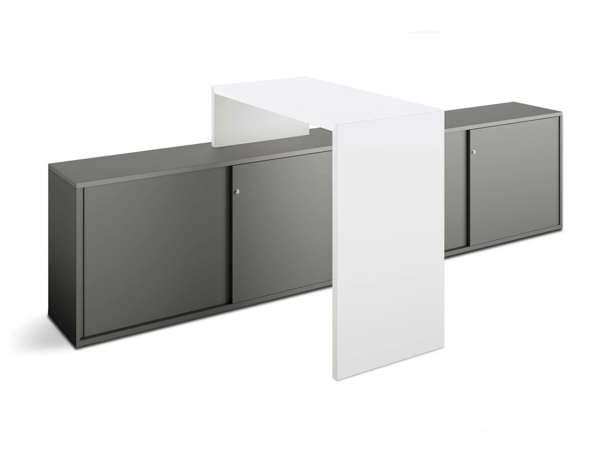 K-Modules are communication modules for spontaneously arranged meetings and get-togethers and informal communication. The form and design of the K-Modules are derived from the basic C reception system. The U-shaped bridges with a 38 mm lightweight design are available in the widths 120 cm to 260 cm. The K-Module Stand serves as a platform for stand up meetings and can also be equipped with optional drawers.