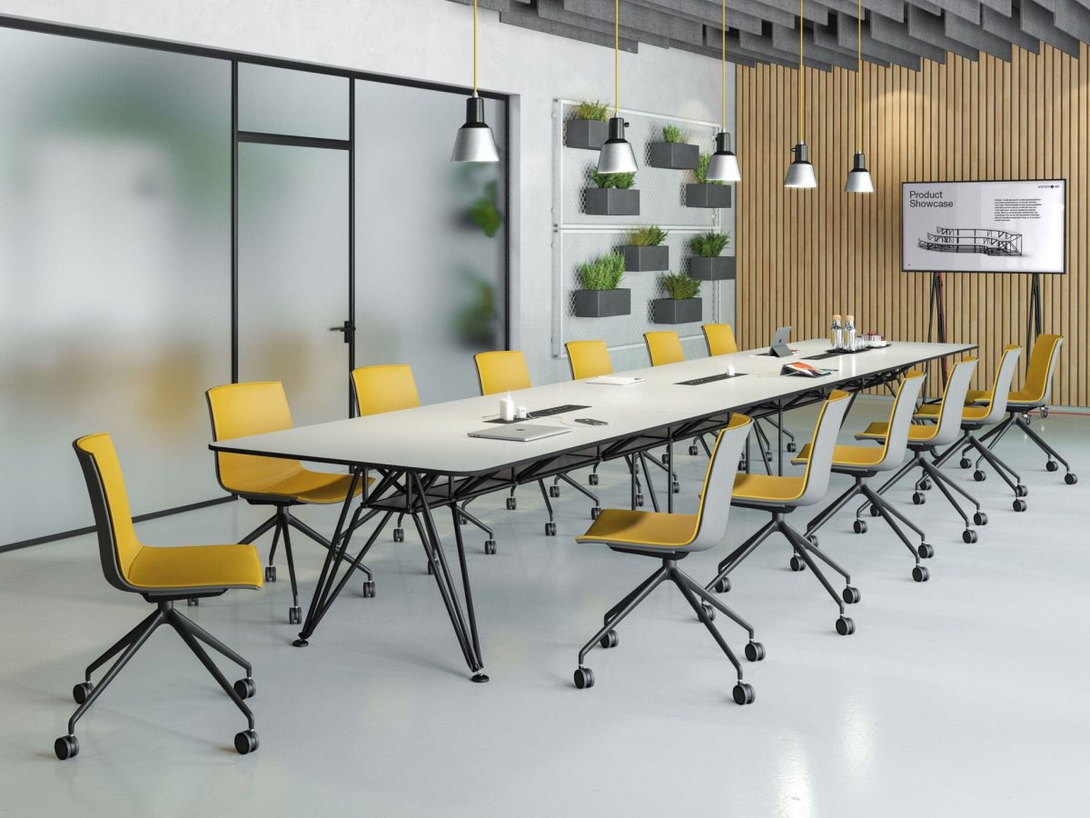 Conference table, 1-piece tabletop 16 mm with black edge, under-tabletop storage space, swivel feet, optionally with device box.