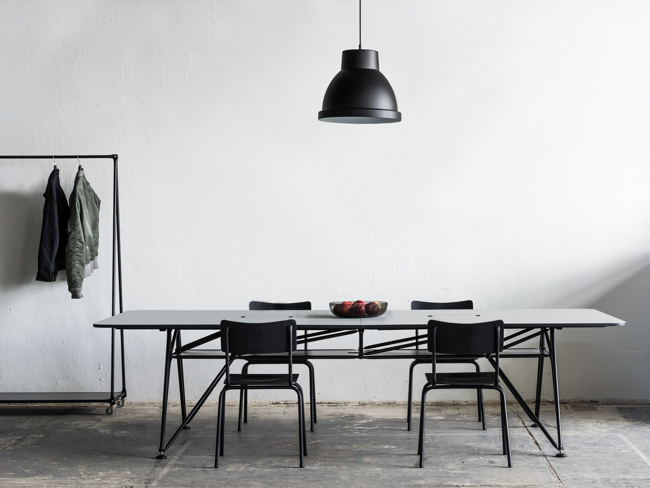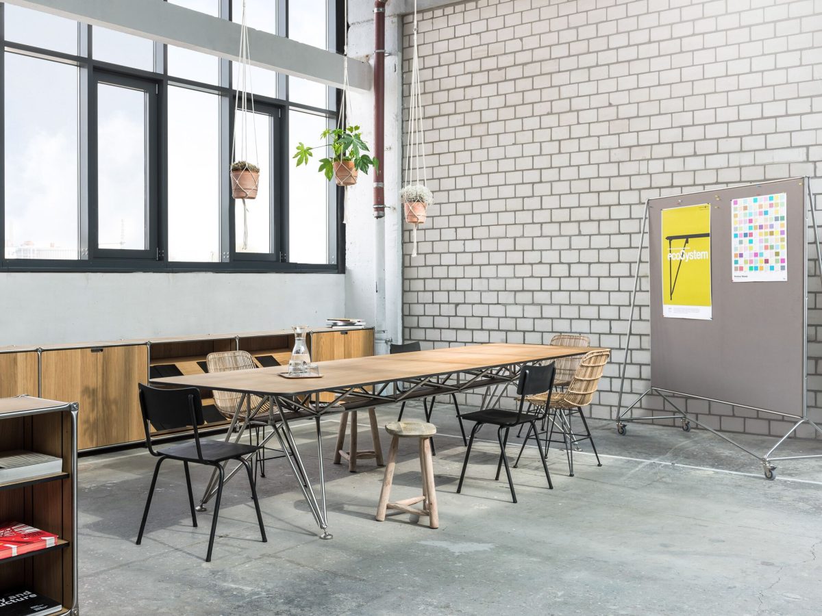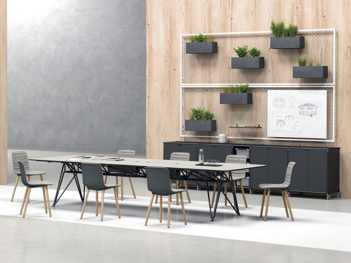 The unmistakably stylish K table system is predestined for large-scale table systems. As a conference table, workbench or bar table variant, the individually plannable and changeable program offers space for up to 16 people. A variety of surfaces are available, from uni decor to high-quality furniture linoleum, and the finish of the unmistakable frame can also be selected. The second level under the table surface can be used as a shelf for work materials or as storage space for technical components, optionally concealed. Additional features such as technology inserts, boxes or tops allow zoning of the surface and the fixation of technical tools.