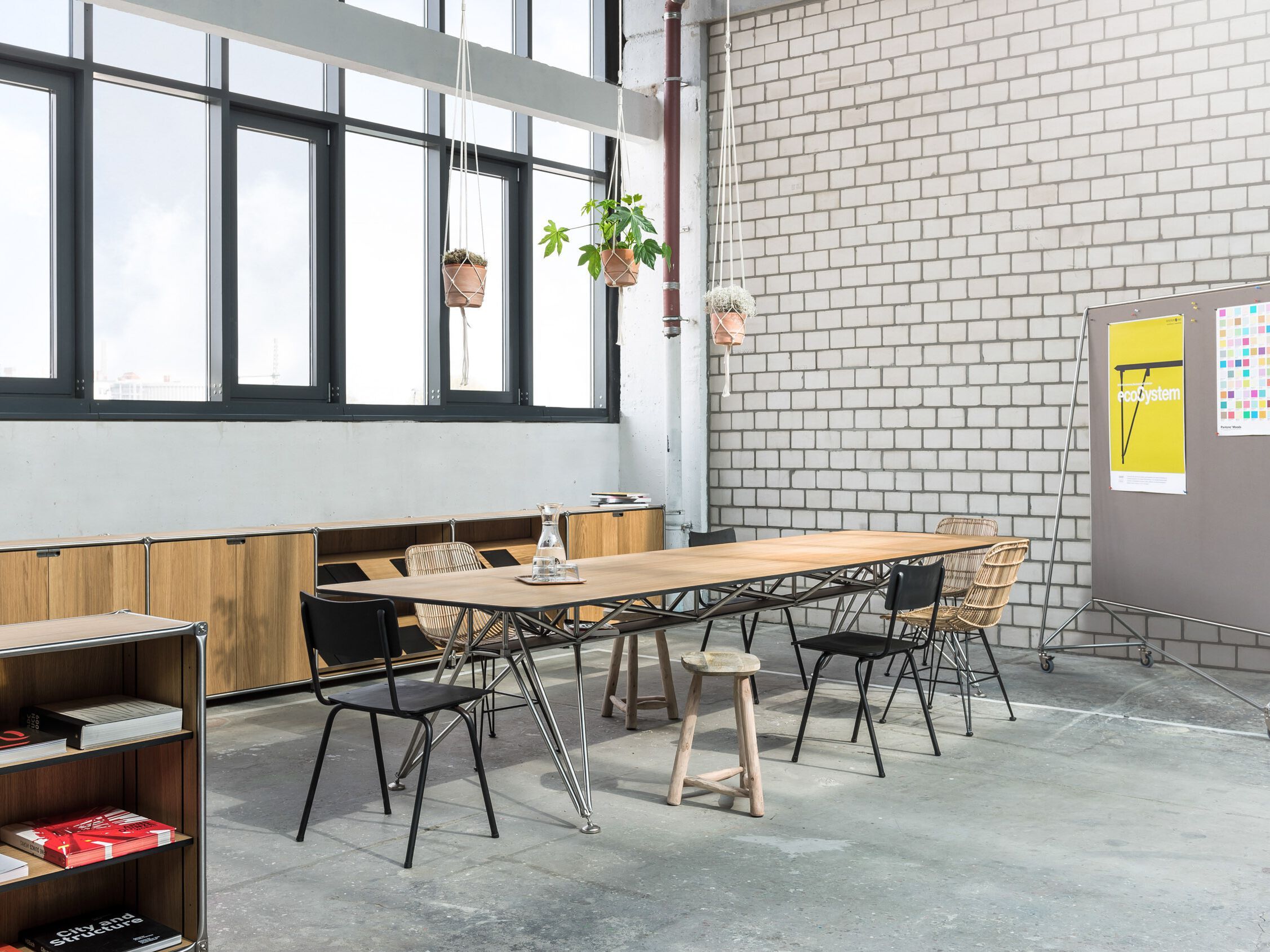 The unmistakably stylish K table system is predestined for large-scale table systems. As a conference table, workbench or bar table variant, the individually plannable and changeable program offers space for up to 16 people. A variety of surfaces are available, from uni decor to high-quality furniture linoleum, and the finish of the unmistakable frame can also be selected. The second level under the table surface can be used as a shelf for work materials or as storage space for technical components, optionally concealed. Additional features such as technology inserts, boxes or tops allow zoning of the surface and the fixation of technical tools.